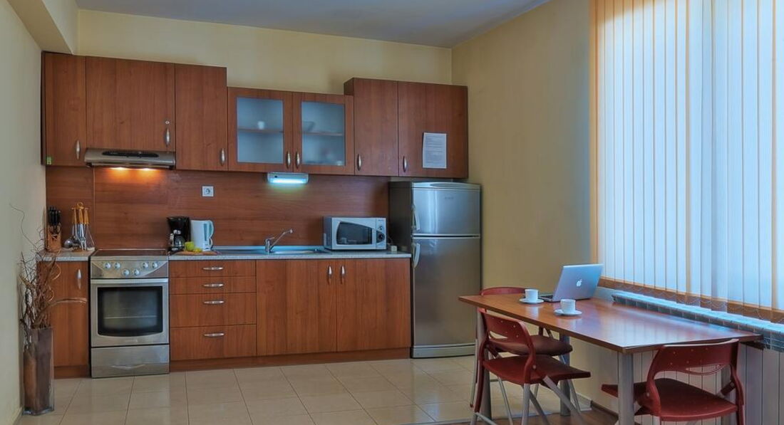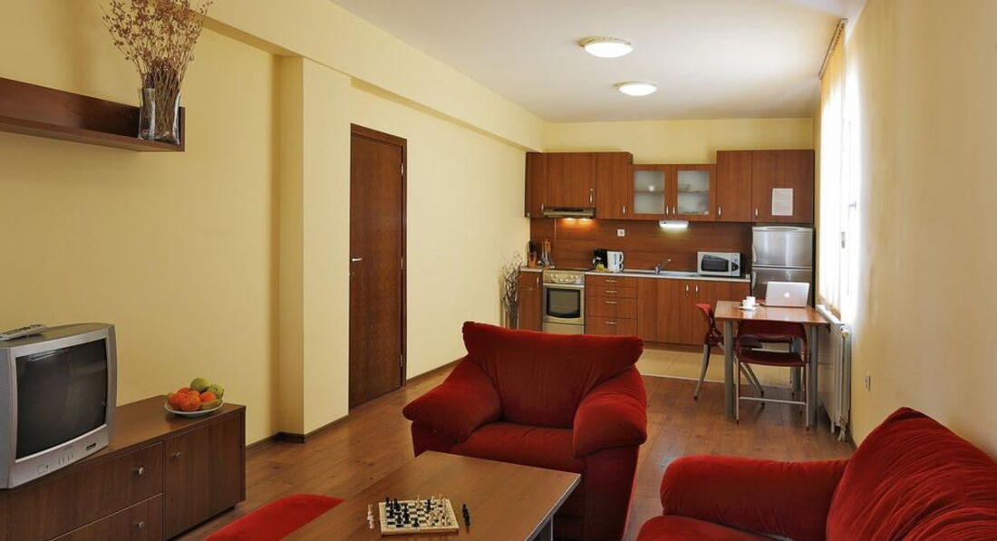Типи номерів: One Bedroom Apartment (спальня з двоспальним ліжком або двома односпальними ліжками, суміжні двері, вітальня з розкладним диваном та обладнаним кухонним куточком (обідній стіл зі стільцями, холодильник, плита, мікрохвильова піч, тостер, кавоварка, електрочайник, посуд, прилади)). 3+1 чол., 60 м2) Two Bedroom Apartment (2 спальні з двоспальним ліжком або двома односпальними ліжками, суміжні двері, вітальня з розкладним диваном та обладнаним кухонним куточком (обідній стіл зі стільцями, холодильник, плита, мікрохвильова піч, тостер, кавоварка, електрочайник, посуд, прилади), 5+1 чол., 80 м2)У номері: