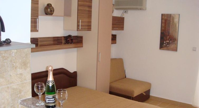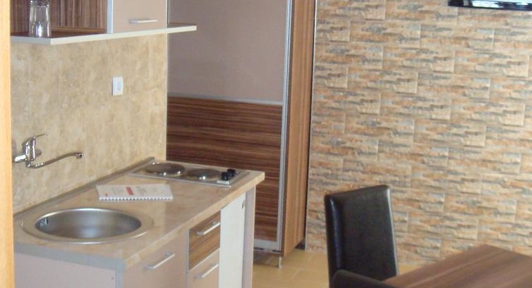 В апартаментах/студіях: міні-кухня, в якій можна готувати легку їжу, електричний чайник, кондиціонер, фен, плазма ТБ (8 російських каналів), душ, тераса зі столом та стільцями, підлога – керамічна плитка