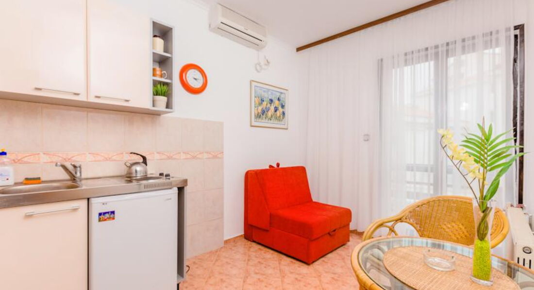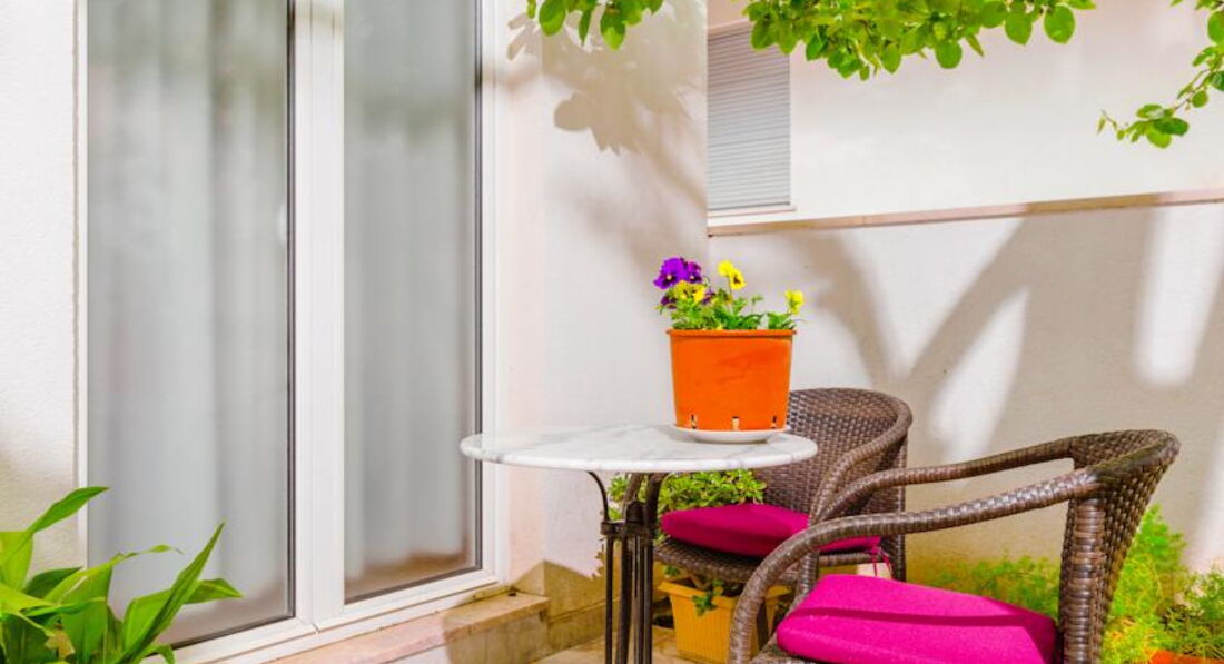 Апартаменти №1: 50м2+ тераса 6м2з видом на сусідні будинки, тераса (за будинком), вітальня з розкладним диваном, кухня, спальня з французьким ліжком. Максимум 4 особи.