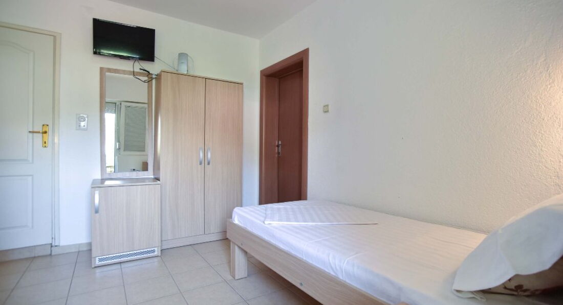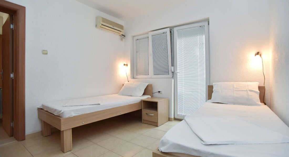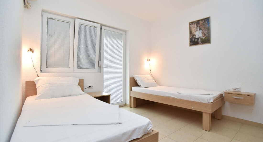 • TWIN (№1,2): 14м2 + тераса 4-5м2 з видом у двір, два роздільні ліжка, тумбочка, шафа, душова кабіна