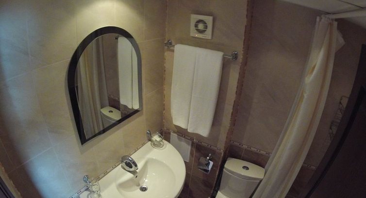 В ванной/туалете есть один минус: вода из душа льется прямо на пол и не вся стекает в сток. Она остается на полу и в коврике, и заходить в душевую/туалет неприятно. Кроме того, эта вода смешивается с песком, который смывается с отдыхающих после пляжа и оседает на полу, и это месиво разносится ногами по номеру. И из-за постоянной влажности в углах "ванной" появляется черный налет. Насколько я знаю, эта проблема присутствует в большинстве трехзвездочных отелей Болгарии.