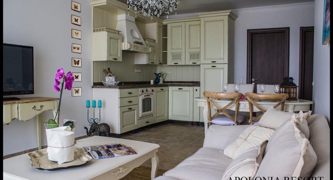 Отдыхали в отеле Apolonia resort apt в конце июня 2016 года. Отель спокойный, для семейного отдыха. Отдыхали с 2 детьми (3 года и 12 лет). Апартаменты большие: у нас была 1 комната и гостинная, комната закрывается дверью. В комнате большая кровать king-size, комод и и шкаф. Для ребёнка 3 лет брали кроватку детскую. В гостиной большой диван, телевизор, тумба под ТВ, журнальный стол, в зоне столовой: обелённый стол с 4 стульями, мини кухня: варочная панель, холодильник, шкафы для посуды. Была кастрюля. Сковороды не было (брала с собой благодаря предыдущему отзыву
