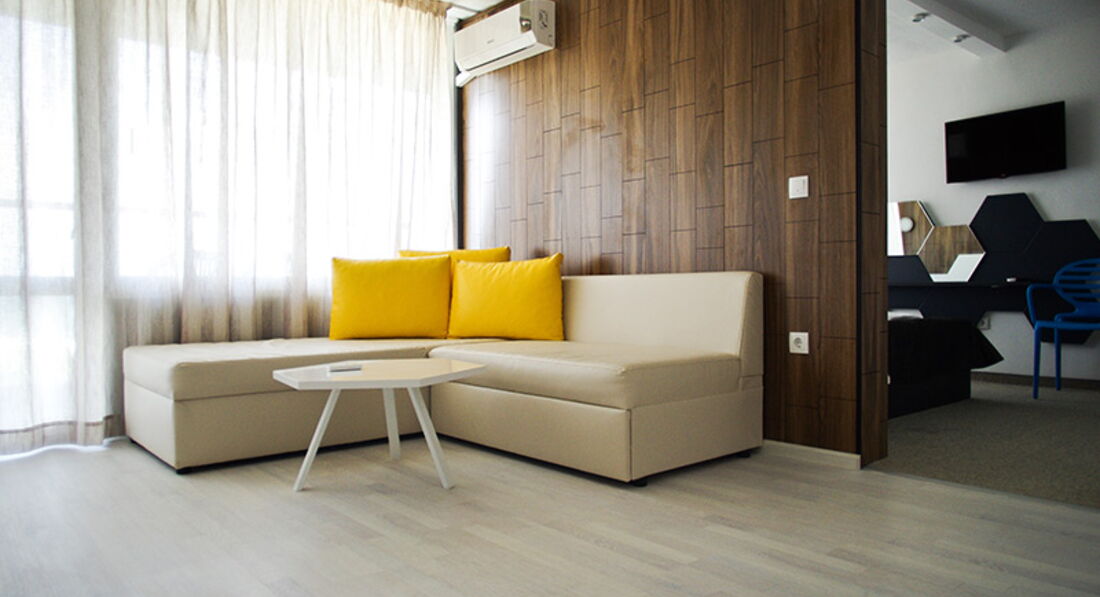 • АПАРТАМЕНТИ – СТУДІЯ – 17 шт., 10 номерів з видом на море, 7 номерів з видом на басейн. Можливо поєднати номери між собою для розміщення сімей (4 номери)
