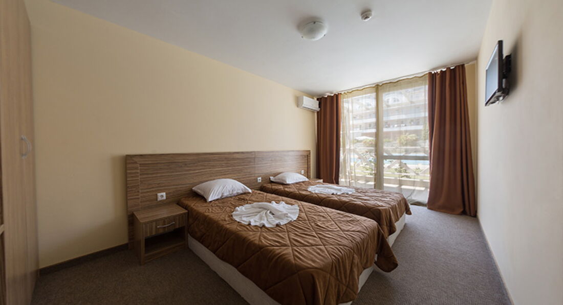 • АПАРТАМЕНТИ-СТАНДАРТНІ — 11 шт, дві окремі кімнати (у кожній кімнаті по два 1,5 спальні ліжка), кухня (холодильник, посуд), ТБ, кондиціонер, балкон, 1 загальний санвузол (душ)