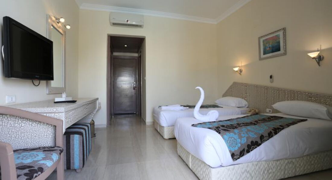 Отдыхал с дочкой в этом отеле с 23 го марта по первое апреля. На рецепшене мужик с хитрой мордой сразу стал просить взятку,типа тогда даст номер лучше. Номер ужасный старый обшарпанный,,замок в туалет не закрывал -вываливалась полностью ручка .Белье старое застиранное в пятнах ,на простынях чувствуются катышки,видно галимая синтетика.На пляже полотенца есть большие хорошие ,но их стараются не давать и не показывать туристам ,а дают почти всегда плохие короткие какого то полинявшего серого цвета.Если вам случайно попалось большое ,советую его не сдавать ,а пользоваться им каждый день.Самое ужасное в первую ночь нас дичайше искусали комары ,пришлось купить фумитокс и весь период пребывания в отеле ,я не вынимал его из розетки,стоит только выключить и они появляются вновь.