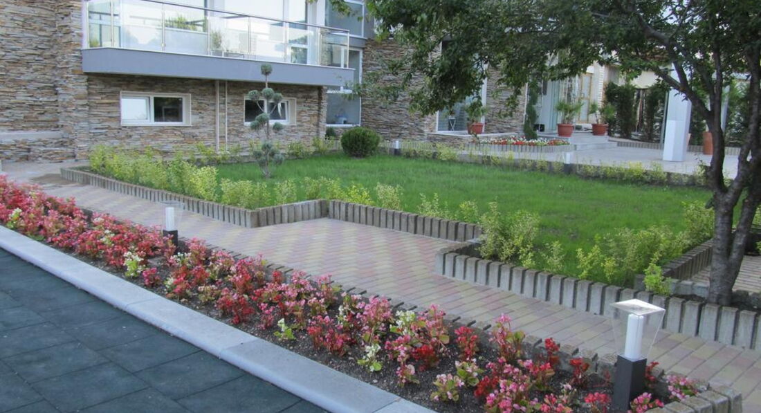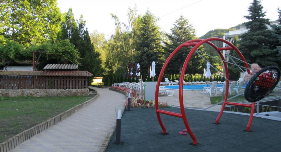 Территории фактически нет, это корпус, небольшой бассейн и детская площадка рядом с террасой ресторана. Есть бесплатная парковка. До кафе и магазинов необходимо будет немного пройти. Очень рекомендую ресторан Извора, уютное и вкусное место, с внутренним двориком, спрятанным от посторонних глаз.