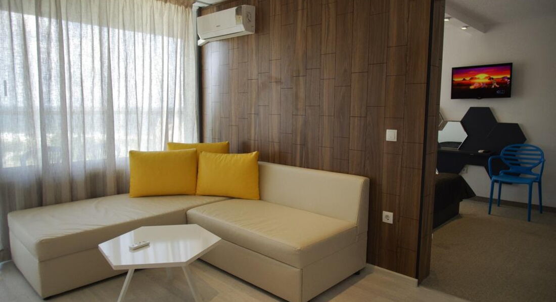 Опис: 2 кімнати (1 спальня з двомісним ліжком, вітальня з диваном), кухня (мікр. піч, чайник, холодильник, посуд), 1 сан. вузол (душ), фен, ТБ (2 шт.), Телефон, сейф, кондиціонер, балкон.