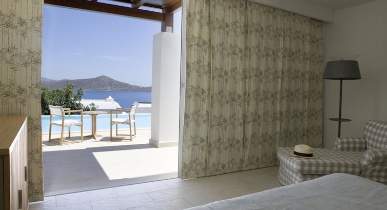 bungalow SV with private pool (у секції бунгало, готель побудований каскадом, тому номери можуть розташовуватися на 1, 2 та 3 поверхах, з видом на море та власним басейном 18 м2, спальня з вітальнею та терасою, двоспальне ліжко, макс. 2 чол. ., 34 м2),