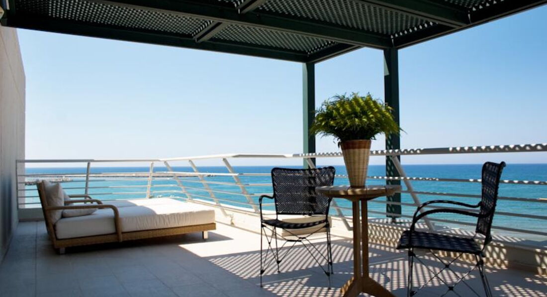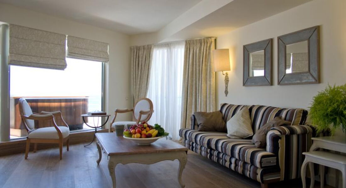penthouse suite (панорамний вид на море, спальня із зоною вітальні та їдальні, двоспальне ліжко, домашній кінотеатр та DVD-плеєр, мармурова ванна та набір ексклюзивної косметики, підлога – паркет, тераса з шезлонгами, прибирання номера – 2 рази на день, макс. 2 чол., 68 м2).