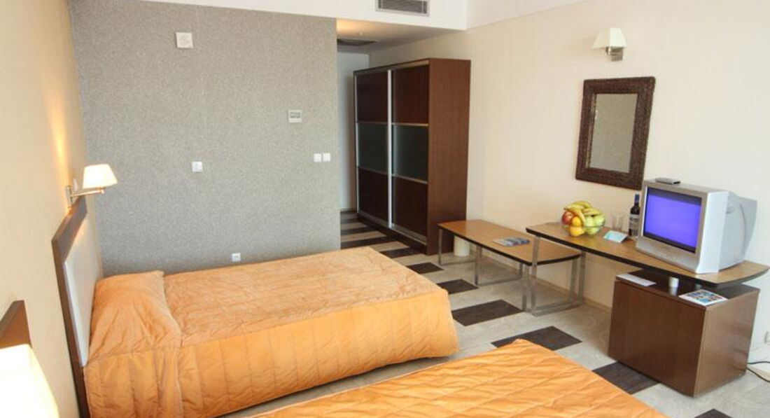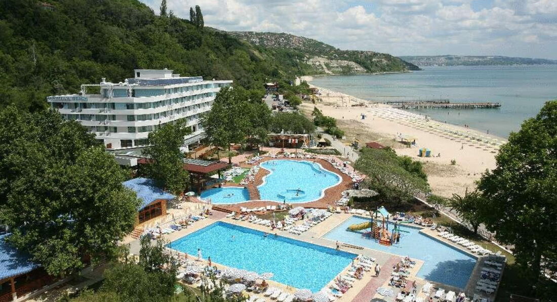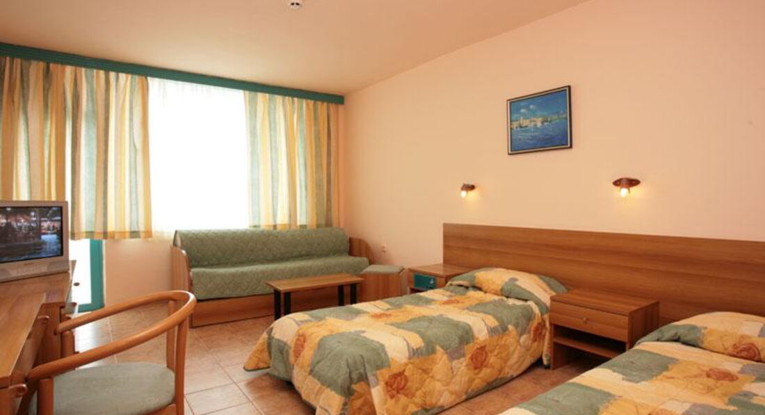 Отель старой постройки 1996г., реконструирован в 2005-2006. стандартные номера большие по площади можно размещать 2 взрослых с 2 детьми(раскладной диван), большой балкон, кондиционер, сейф тоже в номере(платно), фен.Отель- 1 береговая линия , пляж прямо перед гостиницей, через променад, лежаки и зонты платные 5 левов в день(2,5 евро). Есть открытый бассейн, детский бассейн, горки, у бассейнов лежаки и зонты бесплатно. Для детей есть детская площадка. Работает по системе все включено. Нормальный семейный отель, тихий , далековато от центра ночных развлечений. смотрели его в мае, достраивали еще один бассейн, обещали к сезону все доделать!