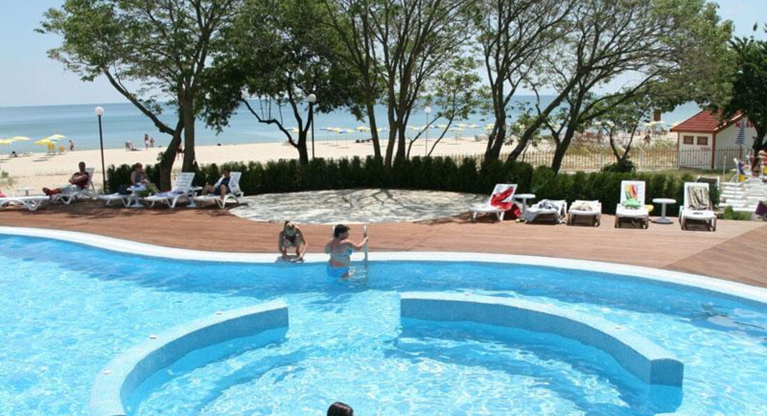 Чистый отельный пляж, лежаки и зонты бесплатно, море мелкое. Бассейны общие с соседним отелем Калиакра. Вода чистая, купаться приятно. Для малышей отдельный большой бассейн. Уборка прилегающей к бассейнам территории оставляет желать лучшего. Много грязных шезлонгов.