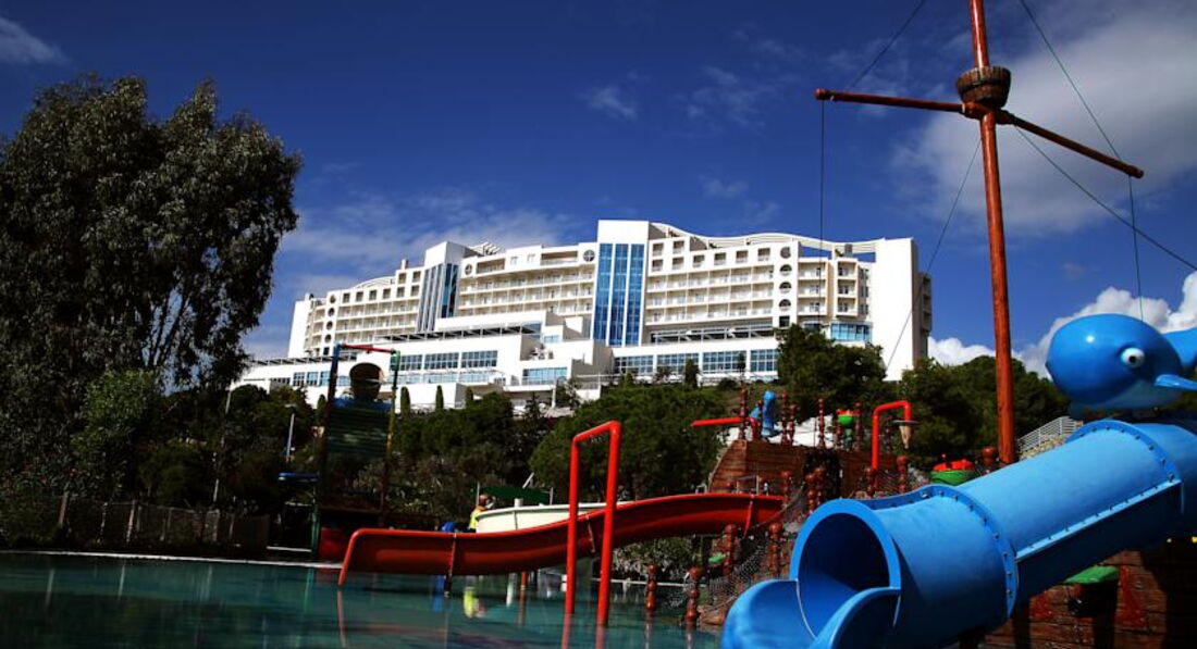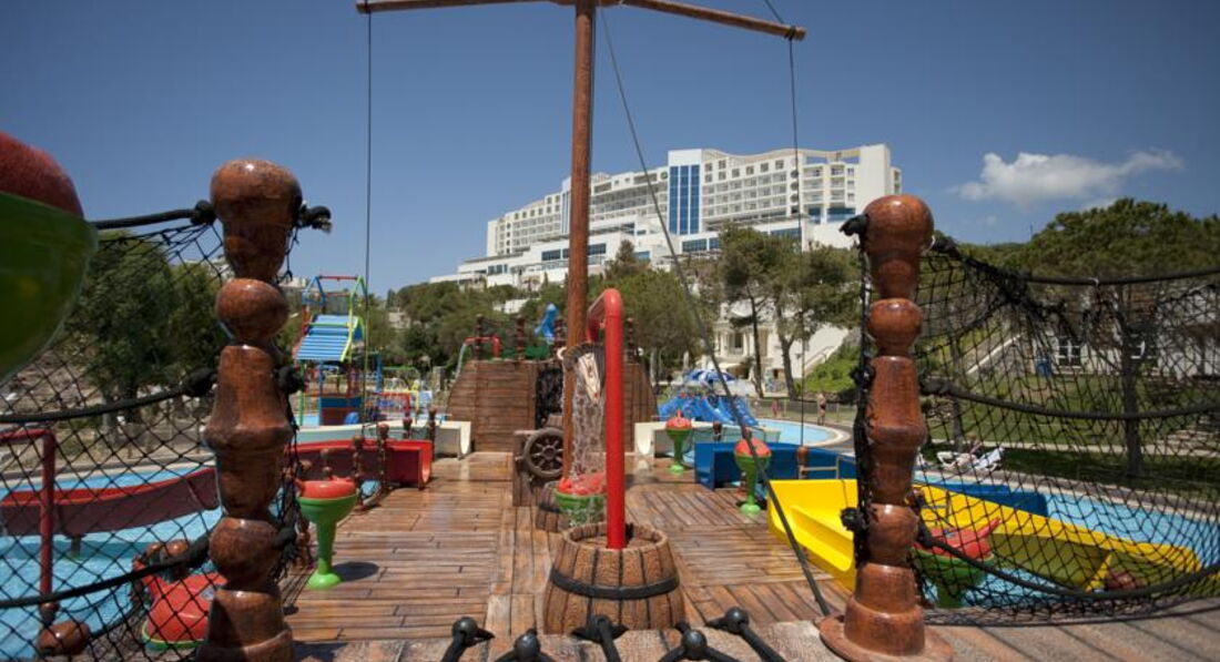 Отель очень большой и очень красивый. Территория ухоженная, бассейны чистые, горки просто супер. Из детского бассейна с горками детей было просто не достать. Здесь даже придраться не к чему. Но в анимации никто не говорил по-русски (английский и турецкий).