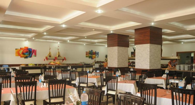 Ресторан в отеле вместительный, персонал прекрасный. Тарелки убирались вовремя, вилки-ложки уже лежали на столе и недостатка в них не было. Еда разнообразна: мясо, рыба, гарниры, супы, овощи, каши, фрукты (арбузы, дыни, яблоки, апельсины), десерты. Все очень вкусно, всего очень много - голодными не останетесь. Между основными приемами пищи также есть возможность поесть. Обязательно берите лепешки, очередь за ними есть всегда. Мороженое вкусное, бывает каждый день. В напитках тоже недостатка нет. Соки, кофе, чай. Вода бутилированная будет ждать вас по приезду в номере. В дальнейшем ее можно взять у бара.
