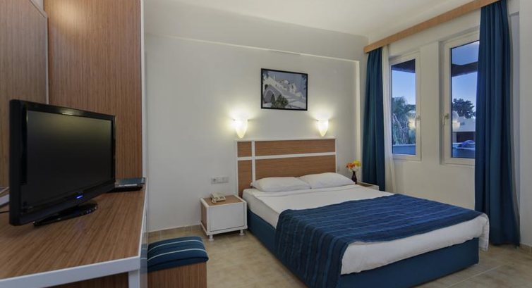 Номер был со старой мебелью и сантехникой, много муравьев. Уборка номера,даже в момент приезда. отвратительная.Впрочем все, что было в номере(кондиционер, душ, умывальник, туалет, фен) все было в исправном состоянии. ПИТАНИЕ-из мяса только курица и непонятная мелкая рыба. Выбор как бы есть, но по факту его практически нет. Много сои, безвкусного сыра, невкусной выпечки. Если прийти к середине обеда-можно уже не застать и курицы. ДЕТСКАЯ АНИМАЦИЯ - есть детская площадка (батут в плачевном состоянии, пара качелей, пара горок). Детские аниматоры детьми не занимаются вообще (на наших глазах маленькая девочка была в истерике, а аниматор разговаривал со своими, не обращая на нее никакого внимания).ПЛЯЖ-замечательный, песчаный. Вход в море: чуть больше метра-достаточно крупные камни (ноги не порежешь),дальше песок. Если заходить в море чуть правее-вообще все отлично. Вход в море очень пологий, что очень удобно для детей. НО пляж маленький и очень много людей, если с утра не занять место-лежаков не найдешь (и это во второй декаде мая).ВЫВОД: мы втроем отдыхали неделю за 600дол.,поэтому были готовы к такому(по соотношению цена-качество).НО в сезон,как минимум, В ДВА РАЗА ДОРОЖЕ-поэтому ВЫБИРАЙТЕ ДРУГОЙ ОТЕЛЬ...