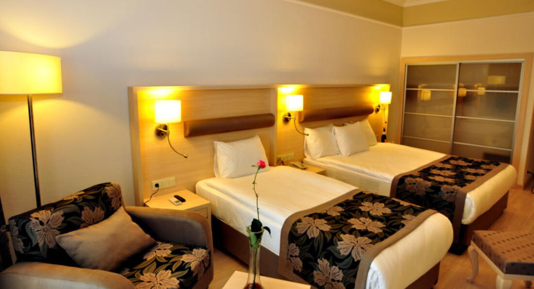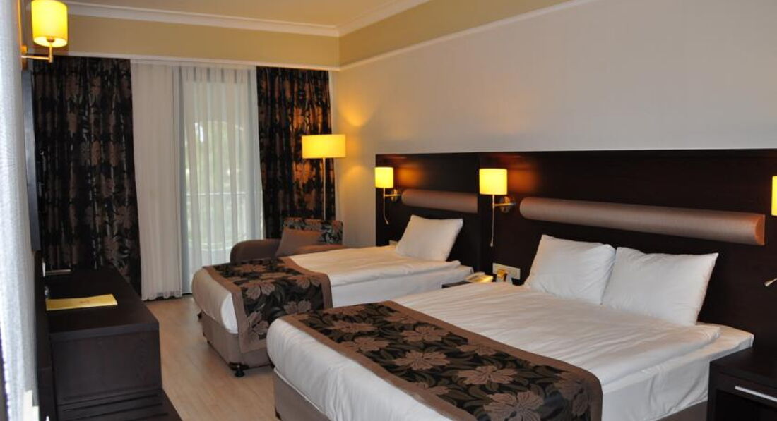 Вчетвером поселились в стандарте к.201 (см.фото), однако стандарт вполне приличных размеров, новая мебель, ламинат без грязных ковролинов. В стандарте двуспальная кровать с нормальным матрасом, ещё полуторка и раскладной диванчик, балкон, большой телевизор. Так же побывали в фемили 2-х комнатном в соседнем корпусе. Номерной фонд на мой взгляд вполне приличный. При выезде доплатили 20евро за продление номера до 16часов. Если придираться то вид из моего номера был на дорогу а внизу была вентиляция из ресторана с запахами, но на мой взгляд не критично совершенно, номере не ощущалось вообще. Из окна была и анимация с музыкой и тп по времени до 22-30, а в турецкую ночь до 24, потом тихо.