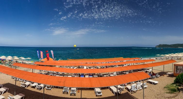 Власний піщано-гальковий пляж за 300 м від готелю. Парасолі, шезлонги, матраци – безкоштовно, рушники – за депозит. Між готелем та пляжем проходить дорога та променад. Протяжність пляжу – 20 метрів.