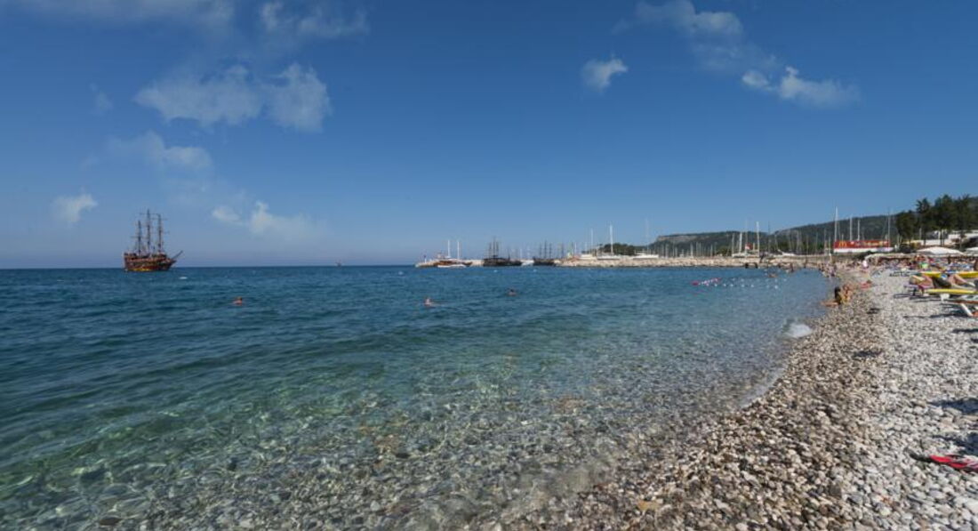 Расположен в центре Кемера, до пляжа 3 минуты,вода кристально чистая, лежаков конечно маловато, но при желании всегда можно найти ..