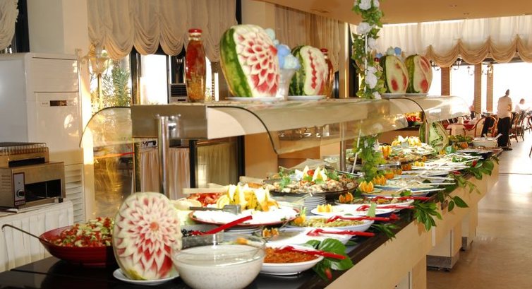 Питание вкусное, но однообразное.. мясо, рыба, кура,печень есть всегда, много зелени,салатов из овощей,сыр, много булок, мне очень понравилась печенный картофель(всегда стоял, там где жарят на гриле), сладости тоже есть, из фруктов: яблоки двух видов (оч. вкусные)грейпфрут, мушмала, бананы, зел. сливы. На обед и ужин все напитки приносит официант. Оч. порадовали кофемашины, они везде и кофе приличный(попробуйте г. шоколад-вкусный,но он не во всех автоматах), кофе можно было налить в любое время, т.е. утром идете на пляж еще бар закрыт, а автомат работает. Кстати и в столовой и в баре на пляже есть айран, но почему то это особо не афишируют, соки как и всегда по типу юпи. В баре на ресепшине всегда стоит вода в бутылочках по 0,5, т.е. если вы надумали погулять или на экскурсию, то можно прихватить собой, там же всегда выпечка ,яблоки и крутятся торты в холодильнике. Есть там можно целый день, оч. вкусное мороженное(лимон, фисташка, клубника,шоколад, ваниль), там же бабушка пекет гезлиме.., в баре около пляжа делают пиццу с разными начинками (нам оч. нравились с сыром, с пивом самое то), гамбургеры, чизбургеры, фри,макароны делают прямо при вас, что закажете, очередей я не наблюдала ни где, но у нас основной контингент были старые престарые немцы, уже ближе к нашему стало больше русских, дебоширов не было, все прилично...