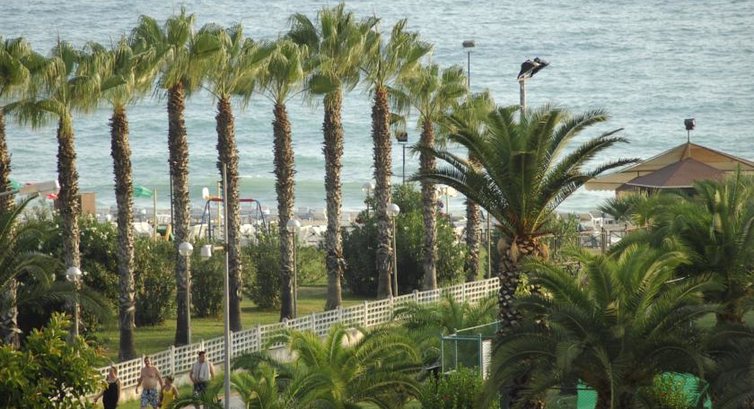 Погода мягкая-28-30 в тени, море 24-25 (ближе к 15му-18 числу погода подпортилась, небольшие дождики, пасмурно, ночью гроза, море прохладнее, последние 2 дня уже и не залазил, только перед отъездом). Пляж песок, шезлонги -лежаки платные, билеты в отеле дешевле.