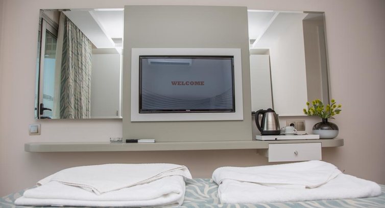 Номер маленький, но лично меня это нисколько не смущало, так как я отдыхала одна. Мебель не очень новая, но вполне нормальная на вид (опять же, для меня это было не так важно, т.к. я ехала отдыхать в Турции, а не проводить время в отеле :))