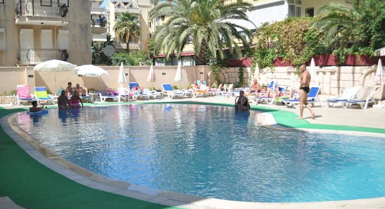 отдыхали с подругой в октябре брали тур по принципу что подешевле, получилось на неделю 13 т на одного, до этого отдыхала только в 5*, первое впечатление на 4, разместили быстро, номер хороший. все чисто и все в рабочем состоянии, персонал понимает по русски немного, так как был конец сезона ребята в баре нам так показалось уже притомленные туристским сезоном)) тем более от русских туристов) в отеле было много русских туристов даже большая часть! молодежи тоже хватало, из 7 дней 4 был дождь, спасло только то что была хорошая компания из тех кто отдыхал в отеле на последнем ужине сидели все за одним большим столом) Очень радушно отнеся управляющий отеля, так как было закрытие сезона был щедр и угощал платным алкоголем из бара, дал воспользоваться своим компьютером в кабинете, был очень вежлив и обходителен, ходили на бар стрит, очееень понравилось обратно прошлись пешком, на улице спокойно ни кто не пристает, если сами не захотите))Отель находится рядом с пляжем, лежаки платные, но мы проходили подальше по берегу на купленых плетеных ковриках лежали, пляж не очень чистый, море прохладное,Ходили гулять по городу дошли до амфитеатра, если подняться на самый верх то видно панораму первых линий и моря. Рядом много магазинов, ездили на Памуккале советую всем может долго ехать но оно того стоит!! даже не смотря на плохую погоду хочу еще раз там побывать.Мармарис оставил впечатление "синдром детского лагеря" хочется возратится туда снова и снова, отель тоже очень понравился за добрую и уютную атмосферу, и еще н смотря на то что отель рядом с набережной нам не было слышно громкой музыки мешающей спать.