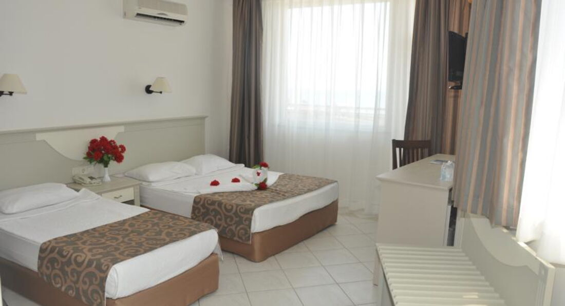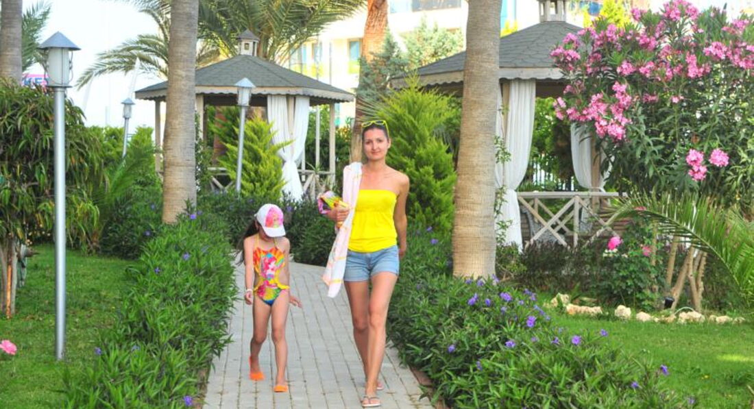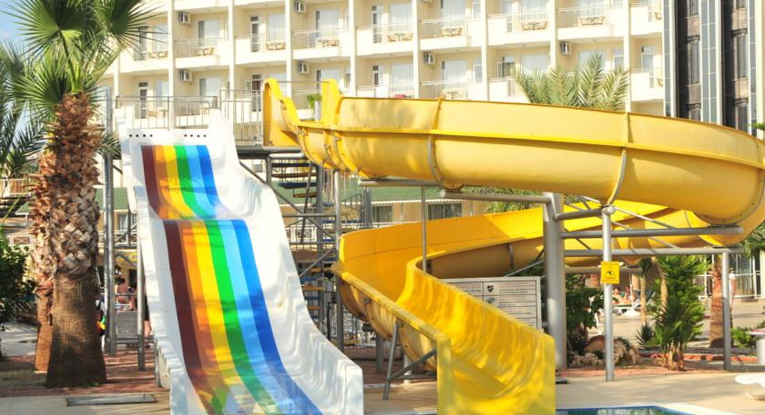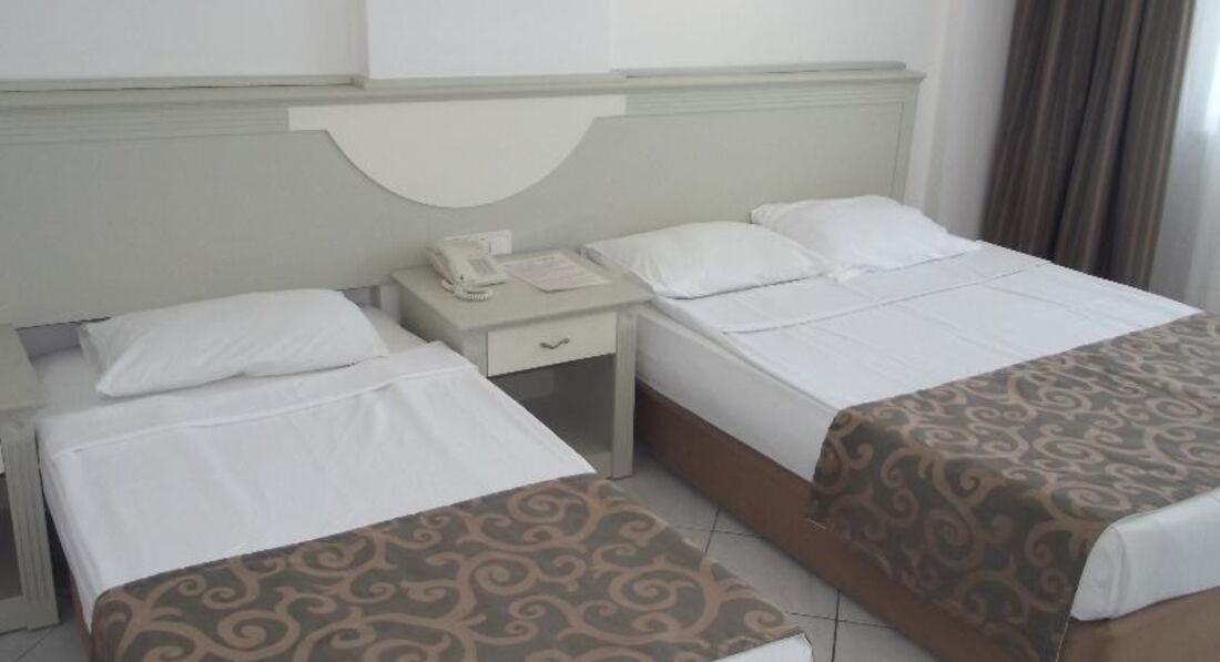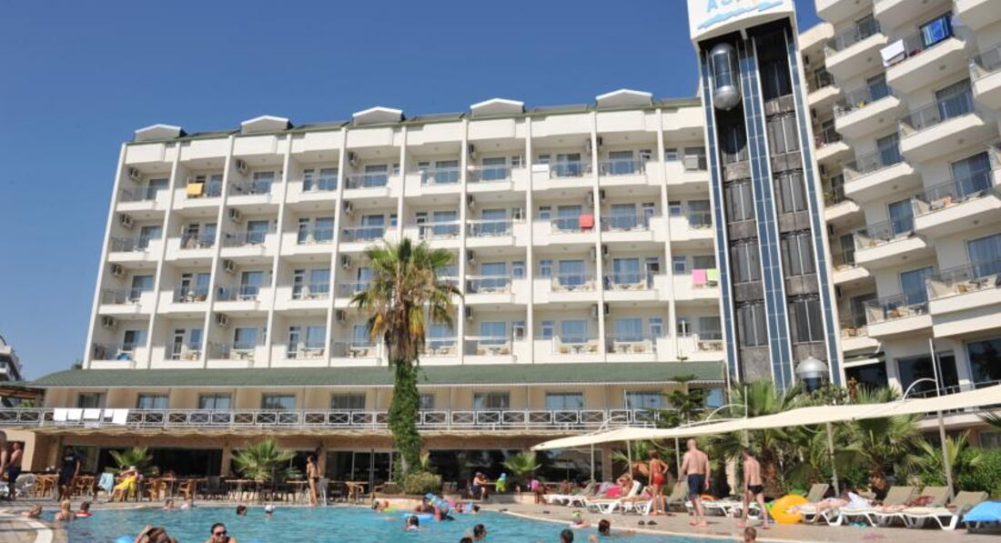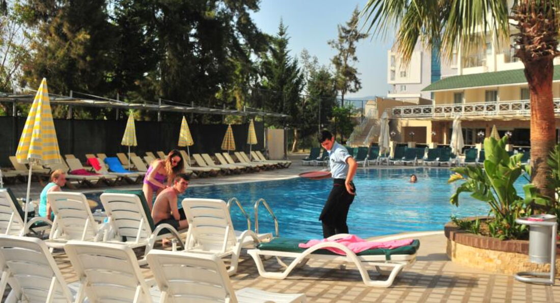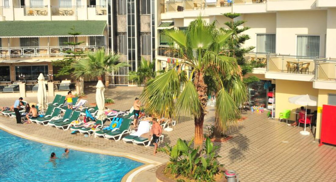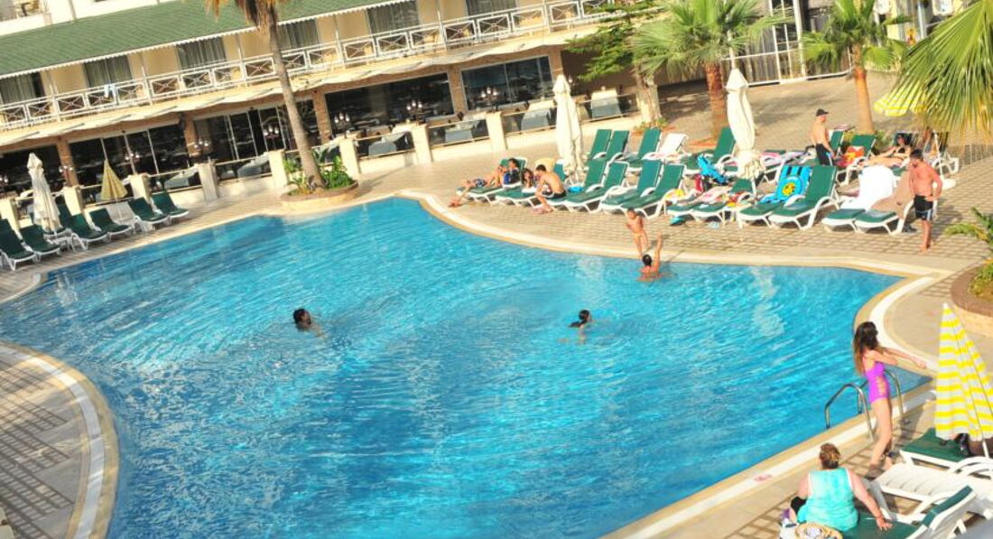 Выбрали отель сами,по своему бюджету,видели,что отель скромный,но зато море рядом,две горки ,так как ребёнок очень хотел горки.Заселили хорошо,номер на 5 этаже стандарт,вид прекрасный,на море,на горы,очень красиво,в номере всё работало.Убирали правда плохо,песок с пола сметали,постель поправляли,и всё,но мы сами брали в коридоре у уборщицы полотенца и туалетную бумаг,а то не дождёшься.Дней 5 было полно лежаков,еды,в бассейне и на горках почти никого не было,мы даже удивлялись,а потом начался мусульманский праздник и приехали турки с семьями,и начался ужас,в бассейне,на горках,в столовой,везде очереди,все хватали мясо,рыбу,за которой и так очереди,ничего не доставалось,за котлетами в баре на пляже очереди,вообщем с мясом проблемы,а так овощей полно,рис,картошка фри,колбасы,соевые котлеты,голодным не будешь.Мы на обед в столовую не ходили,а обедали в баре на пляже.Лежаков на море потом тоже не стало хватать,но мы и приходили поздно,часов в 10.30, еле находили один на семью,клали вещи и шли купаться,а потом к обеду ,когда все расходились ,лежаков уже много было.Море хорошее,когда надоедало купаться,ходили далеко от отеля по берегу,где большие камни,там дикий пляж,других отелей нет,в камнях смотрели крабов,красиво.Вечером хорошая анимация,пенная дискотека была на берегу моря,ребёнку очень понравилась.Отель хороший,если не придираться к мелочам,то отдых очень понравился,вообщем как себя настроишь.