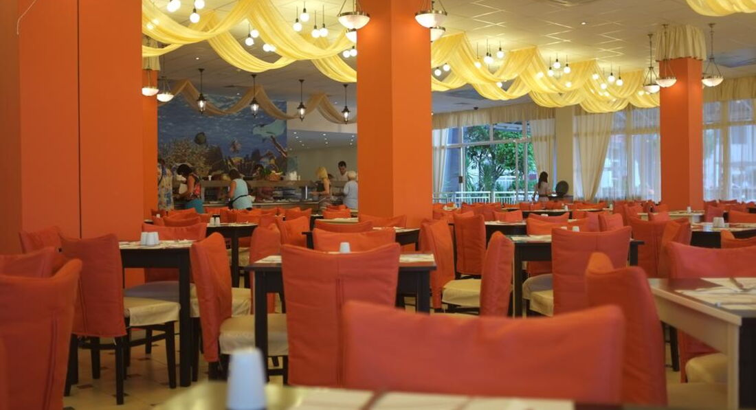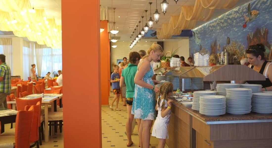 Были на отдыхе с мужем и ребенком 11лет.Номер шикарный с видом на бассейн.Убирали каждый день даже если не оставляли чаевых.Постель поменяли один раз в принципе этого достаточно.Полотенца каждый день,если бросали на пол.Что касается еды...Еда конечно немного однообразна,но голодным никто не оставался.Мяса было много разного и варенного и жаренного.Рыба была только однажды а овощи и фрукты были в асортименте.Приносили пицу,но детки стояли в очереди и моментально расхватывали.В 16 выносили 4-5видов мороженого можно было брать без ограничений.Единственный минус в том что не разрешали выносить еду причем доходило до абсурда на входе отбирали сумки и проверяли при выходе.Это конечно оставило неприятный осадок.В остальном обслуживание было хорошее.На рецепшен обратились один раз попросили утюг.Утюг сразу же дали.Разговаривали вежливо ,улыбались(придраться не к чему). Расположение отличное 30-50м до моря.Лежаки всегда были ,но лежат они 15м до моря.Бар на пляже это небольшой вагончик там всегда была очередь,но очень удобно что всегда есть вода и холодное пиво под рукой.Ребята бармены молодцы,работали хорошо .Бар возле бассейна закрывался в 20.00 лоби-бар в 22.00.Отдохнули хорошо погода не подкачала.В общем если вы не придирчивы к еде это хороший отель.