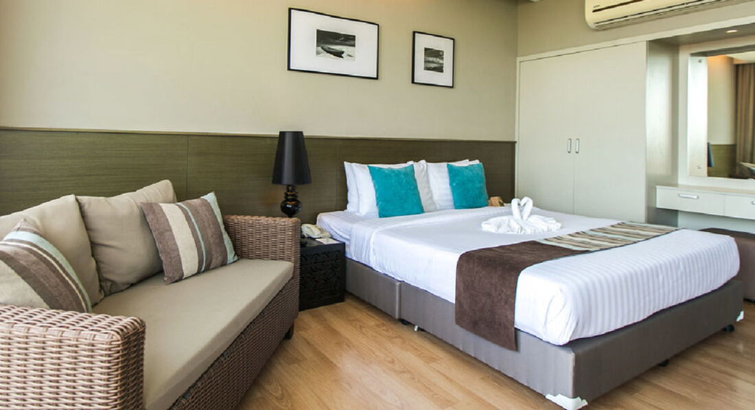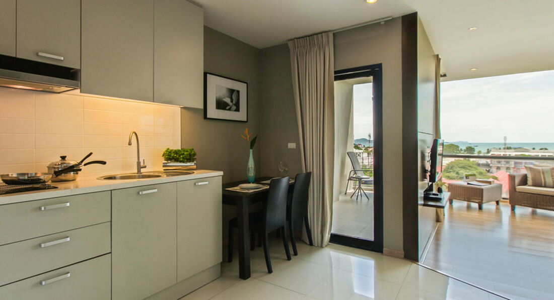Номер у нас был студия (кухня+комната), балкон, душ и туалет. Мебель новая, свежий ремонт. В номере всё есть как в квартире, плитка, чайник, микроволновка, тостер, холодильник, посуда (можно покупать продукты в Big C и самим готовить) Единственное, что не много напрягало это очень мощный и шумный кондиционер, ночью мешает спать) Мы жили на 7 этаже, с видом на бассейн и на город, вечером было очень приятно посидеть на балкончике, балкон довольно большой.
