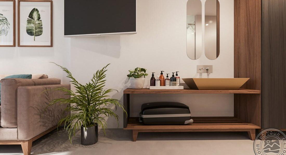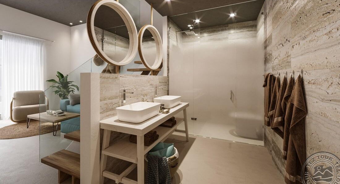 • Atermono VIP suite SV private pool (вид на море, дворівневий номер, на верхньому поверсі осн.ліжко – двоспальне або 2 односпальні, на нижньому поверсі доп. – 2 софи, індивідуальний басейн (24 кв.м), макс. 4 чол. ., 40 м2)