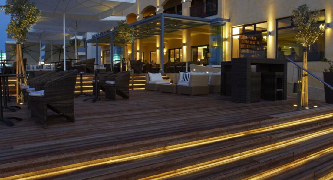 Затишний готель із невеликою територією, що потопає у зелені. Зручне розташування. Широкий вибір напоїв класу люкс, колекційних вин та шампанського. Навпроти готелю знаходиться піщаний пляж довжиною 14 км, позначений Блакитним прапором. Звертаємо увагу, що у номерах із видом на море можливий шум від дороги. Готель підходить для молоді та гостей, які цікавляться вечірніми розвагами у місті, а також для сімей з дітьми.