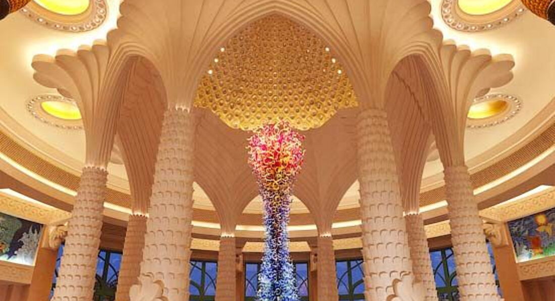 Внутри Atlantis The Palm Jumeirah всё богато и радует взор. Потолки расписные, лепнина, цветочные композиции, в огромных океанариумах плавают сотни рыб.