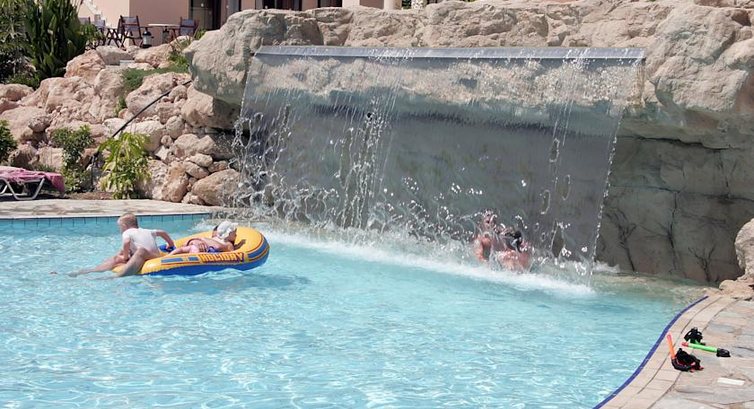Бассейн большой, причудливо изогнутый, даже что-то типа "речки", водопад и пр.