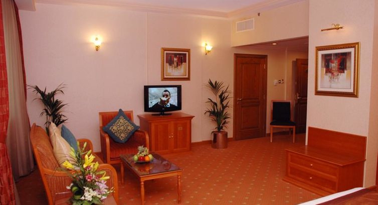 Разместили нас на 2 этаже с видом на достаточно оживленную улицу Аль Ригга (или Рикка). Номер просторный, большая двуспальная кровать, ЖК телевизор, сейф, чайный набор, содержащий маленький электрочайник, две чашки с ложками и коробочку с пакетиками чая, кофе и сахара. Кстати, комплектность этой коробочки регулярно восстанавливалась. Уборка в номере не вызывала нареканий. Белье меняли каждый день, полотенца – через день. Дверь на балкон не открывалась. Шум улицы практически не слышен. Звукоизоляция отличная.