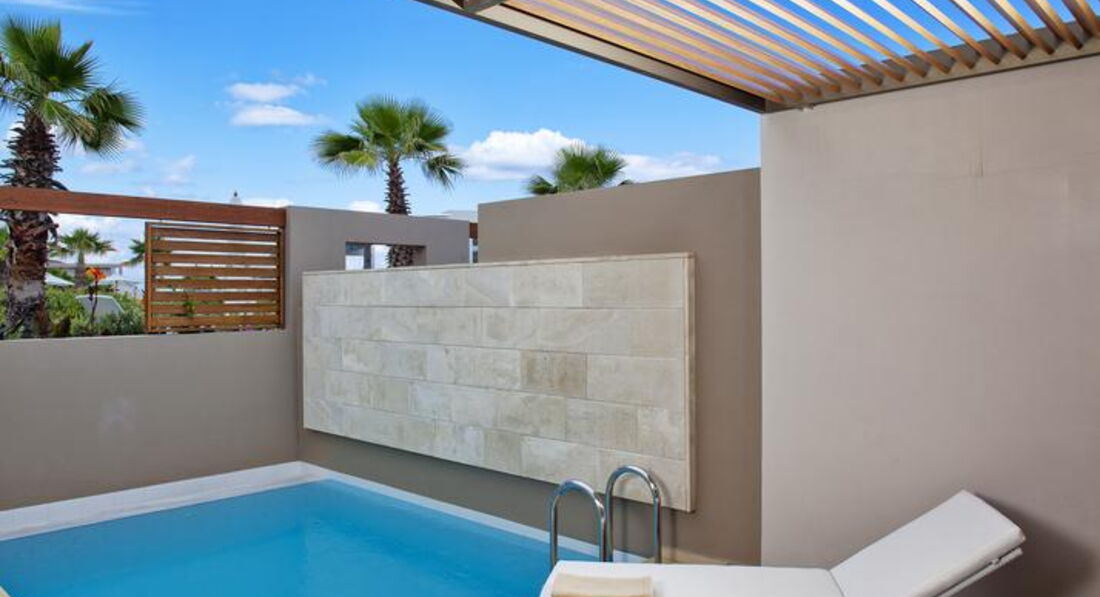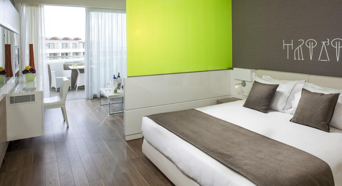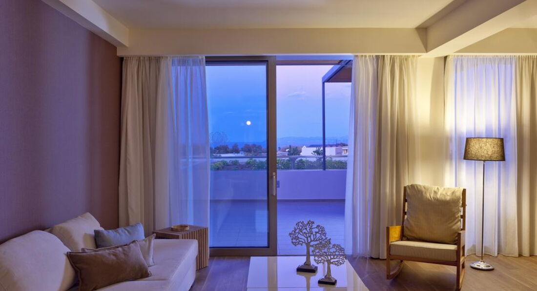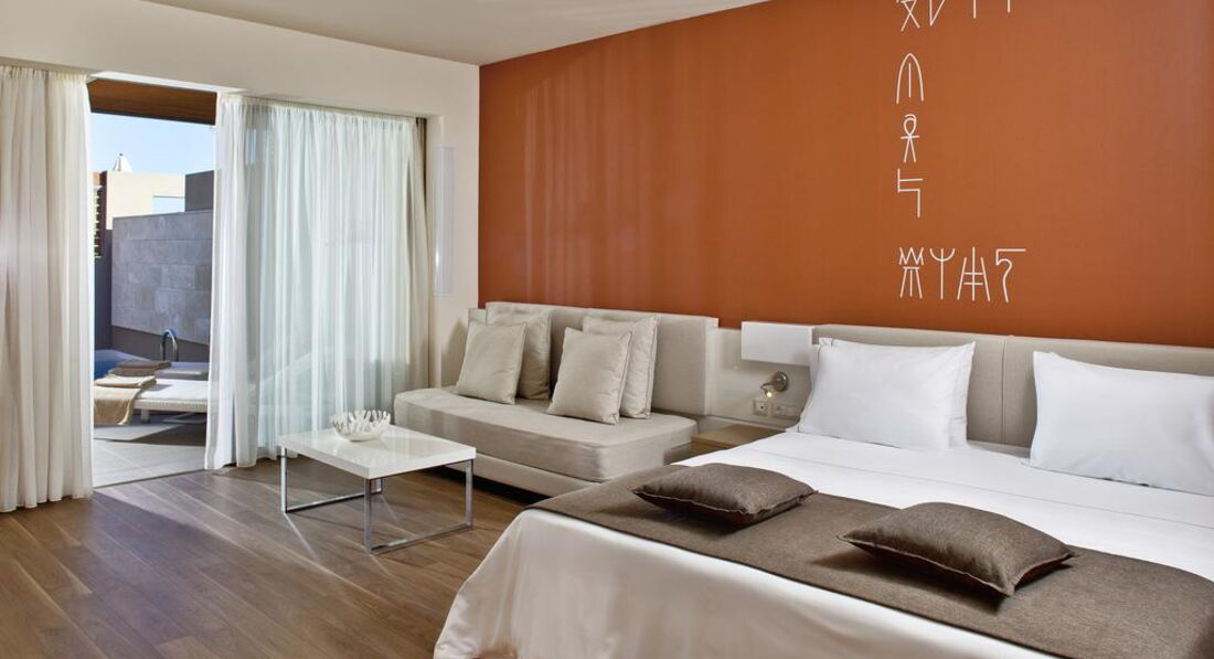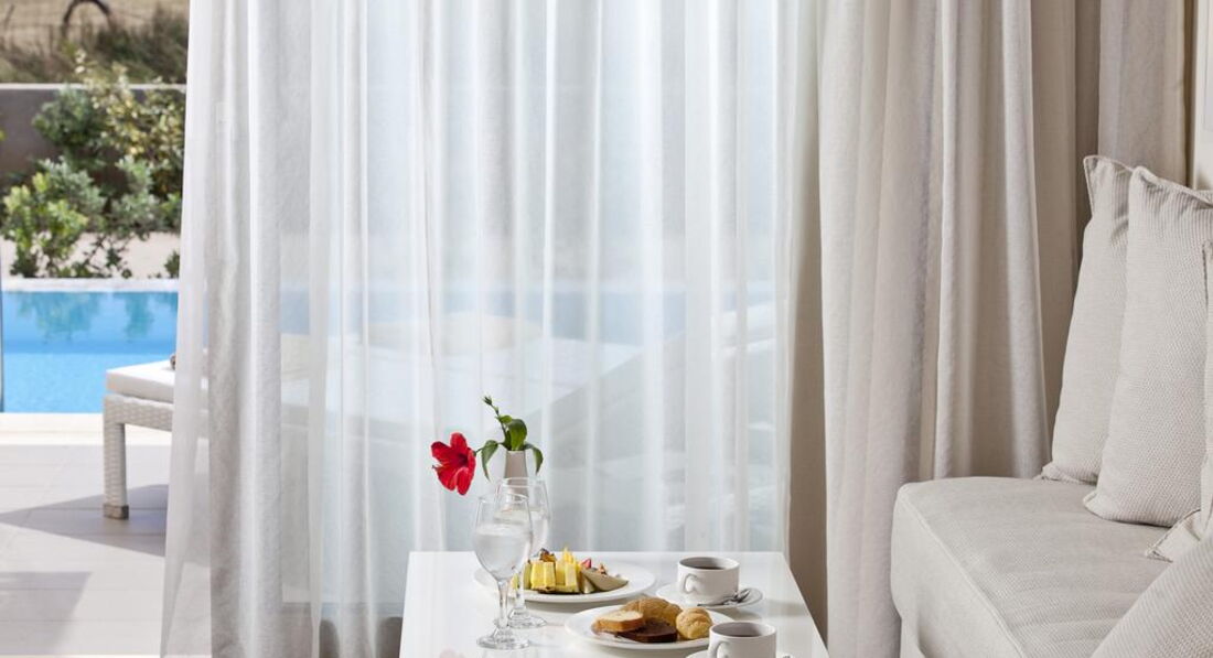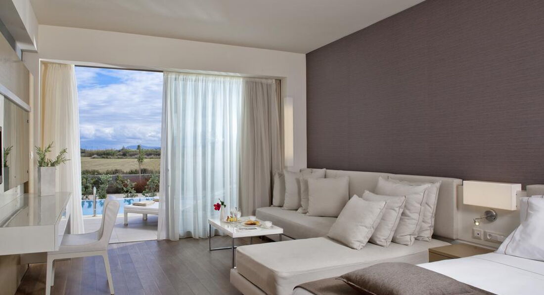 Типи номерів: deluxe room sharing pool (осн. ліжко - двоспальне (2 односпальні за запитом), дод. - диван-ліжко, доступ до загального басейну, макс. 3 чол., 32 м2); deluxe room private pool (осн. ліжко - двоспальне (2 односпальні за запитом), дод. - диван-ліжко, індивідуальний басейн, макс. 3 чол., 32 м2); superior room private pool (осн. ліжко - двоспальне (2 односпальні за запитом), дод. - диван-ліжко, індивідуальний басейн, макс. 3+1 чол., 37 м2); deluxe suite private pool (осн.ліжко - двоспальне ліжко super king size, дод.- диван (розкладне ліжко на запит), вітальня зона відокремлена від спальної кімнати, індивідуальний басейн, макс. 4 чол., 60-62 м2); executive suite private pool (осн.ліжко - двоспальне ліжко super king size, дод.- диван (розкладне ліжко на запит), вітальня зона відокремлена від спальної кімнати, 2 ванних кімнати, джакузі, індивідуальний басейн, макс. 4+1 чол., 90 м2); imperial suite (осн.ліжко - двоспальне ліжко super king size, дод.- диван (розкладне ліжко на запит), вітальня, їдальня та окрема спальна кімната, джакузі, макс. 4+1 чол., 120 м2); deluxe room sea view (з видом на море, осн.ліжко - двоспальне (2 односпальні за запитом), дод. - диван-ліжко, макс. 3 чол., 32 м2); deluxe room pool view (з видом на басейн, осн. ліжко - двоспальне (2 односпальні за запитом), дод. - диван-ліжко, макс. 3 чол., 32 м2); deluxe room garden view (з видом на сад, осн. ліжко - двоспальне (2 односпальні за запитом), дод. - диван-ліжко, макс. 3 чол., 32 м2); family room (осн.ліжко - двоспальне ліжко king size, дод.- диван (розкладне ліжко на запит), макс. 3+1 чол., 40 м2); deluxe suite (осн.ліжко - двоспальне ліжко super king size, доп.- диван (розкладне ліжко на запит), вітальня зона відокремлена від спальної кімнати макс. 4 чол., 60-62 м2); executive suite (осн.ліжко - двоспальне ліжко super king size, доп.- диван (розкладне ліжко на запит), вітальня зона відокремлена від спальної кімнати, 2 ванних кімнати, індивідуальний басейн, макс. 4+1 чол., 78 м2).У номері: сейф: у номері, безкоштовно (електронний) зміна білизни: 3 рази на тиждень кофемашина (Espresso, тільки для номерів типу suite) кондиціонер: індивідуальний (безкоштовно) room service: платно (за запитом) банне приладдя (Apivita) зміна рушників: 3 рази на тиждень CD/DVD-програвач (за запитом безкоштовно тільки для номерів типу suite) телефон підлога: ламінат прибирання номера: щоденно тапочки (не у всіх номерах) фен: є балкон або тераса міні-бар платно (за запитом) ТБ: супутникове Інтернет: Wi-Fi, безкоштовно халат (не у всіх номерах) ванна або душ підготовка номера до сну (тільки для номерів типу suite)