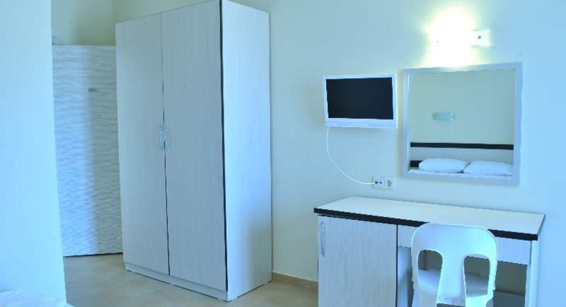 Приехали в отель поздно вечером, поэтому разместили нас сразу. На ресепшен седой турок намекал на бакшиш за размещение, но я проигнорировала. Выбирали номер между четвертым и третьим этажом. Выбрали на третьем, идти ближе. Номер самый обычный,выходил балконом на отель Larissa Garden. В номере все исправно, проблем с водой не было. Уборка номера каждый день, но чтобы заменили полотенца нужно попросить, сами не поменяют.