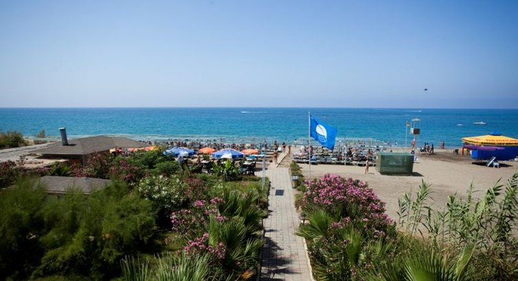 У отеля собственный песчано-галечный пляж, расположенный в 5-ти минутах ходьбы через подземный переход. Пляж отвратительный!!!! Это не песок, а грязная серая субстанция!!! У загорающих пятки черные от такого песка((( Пляж узкий. Море хорошее, теплое. Многие пожилые отдыхающие располагались у бассейна, а на море ходили только искупаться. Поплавают и назад к бассейну загорать и наслаждаться сервисом все включено)))