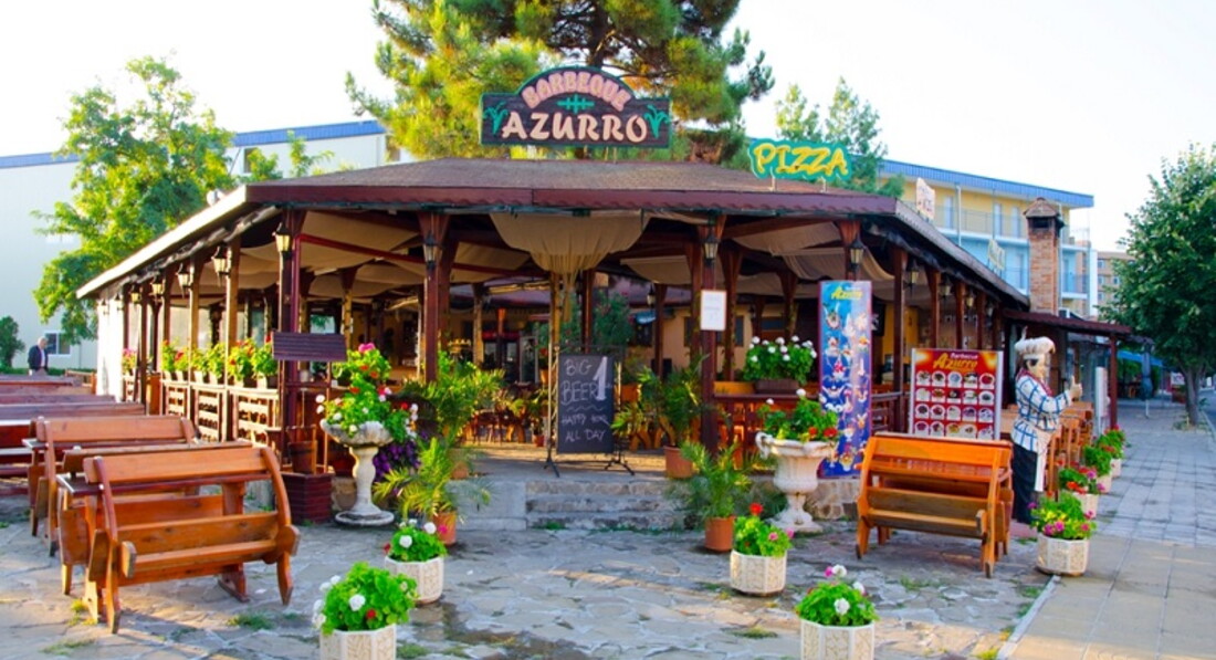 И так расскажу Вам как мы съездили в отель Азуро. Когда выбирали тур было несколько вариантов отелей, и он был не самый дешевый. Отзывы читали, но как обычно пишут кому-то нравится, кому-то нет., решили поехать. Мы были с двумя детьми. Приехали мы в отель в 8 утра, заселение в 14, камеры хранения нет, с учетом того, что с собой были гаджеты типа планшевов, фотоаппаратов и телефонов, оставлять просто на ресепшене не хотелось, примерно в 13, нам надели браслеты и мы пошли на обед, сумки проносить нельзя в столовую, а в сумках сами понимаете, документы, деньги и гаджеты, оставили сумку на мальчика, который записывает кто пришел. Уставшие, мы наконец-то заселились, при этом заплатив на ресепшене 10 лев, чтоб поселили рядом. Номера стандартные, на балконе была целая пепельница окурков, не очень приятно. Уборка в номере была каждый день, белье за 11 дней ни разу не поменяли, полотенца меняли. Познакомились с семьей с тремя детьми, так им уборщица предъявляла то, что крошки на полу, и есть в номере нельзя. О питании. Это какой-то кошмар, на завтрак одни яйца и сосиски. Обед и ужин одно и тоже, удивило то что, на мясе раздача, типа не больше 2-х кусочков на человека. Питание мягко сказать отвратительное. Фруктов мало, персики да сливы, иногда арбуз и дыня, десертов нет, невкусное печень с шоколадом, которое от жары склеивалось и превращалась в кашу. Выносить ничего нельзя, хотя так везде. Еще можно было поесть пиццу и пасту в соседнем кафе, это все раздавалось как раз во время обеды, можно было еще взять мороженое, опять же там раздача, два шарика и все. О территории. Территория маленькая, детской площадки (заявленной) нет, анимации (заявленной) нет, дети не знали чем себя занять, приходилось ходить на атракционы и батуты. Ну и как все русские мы впринципи смирились, если бы не выезд, такого скотского отношения я не встречала нигде, с учетом того что я не в первый раз в Болгарии. Выселили в 12, стандартно, но при этом у нас срезали браслеты и заявили, что обед нам не положен, ребенок в баре попросил пустой станкан, чтоб воды набрать, ему отказали, пошла я, он сказал, нет браслета, нет воды, сказав мне при этом, что это не его проблемы, пожалели воды для ребенка, без браслета нельзя в бассейн, короче ничего нельзя, мы чувствовали себя беженцами какими-то. После 12 часов все сотрудники на Вас смотрят, реально как на беженцев, номер освободили Вы никто, у меня впервые такое, обычно я этот браслет срезаю чуть ли не в самолете. Как сказал нам гид, что до 12 Вы гость, а потом никто. Взяли книгу жалоб, написали такой отзыв, надеюсь, это кто-то читает. В общем мой Вам совет, не выбирайте отель Азуро. Почитайте внимательно отзывы.