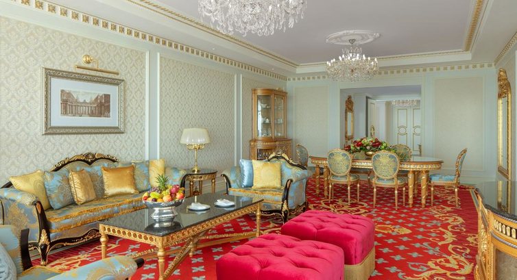 • 1 Royal Suite (695 м2, 5-й поверх, вітальня, 3 окремі спальні, з видом на море/садок, кухонний куточок: столові прилади, Nespresso machine, мікрохвильова піч – на запит, тераса з джакузі, 3 ванні кімнати, ліжко 2 king-size + twin, макс. 7+1 чол.)
