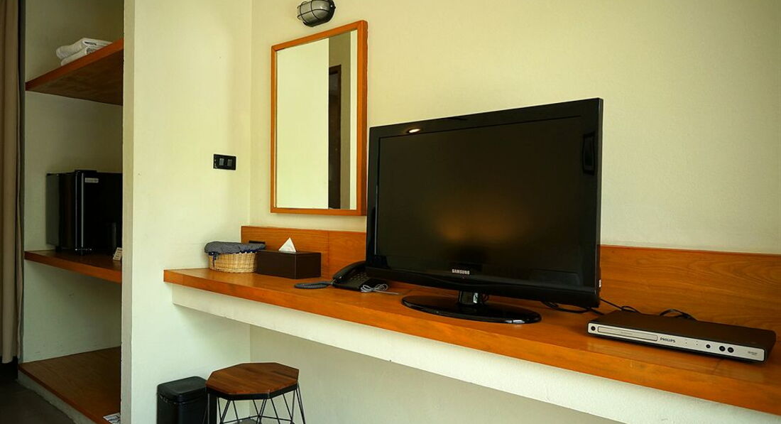 Во всех номерах есть телевизор, двд, кондей, сейф, небольшой мыльно-рыльный набор, фен, пляжная сумка, вода, чайный набор, мини-бар.