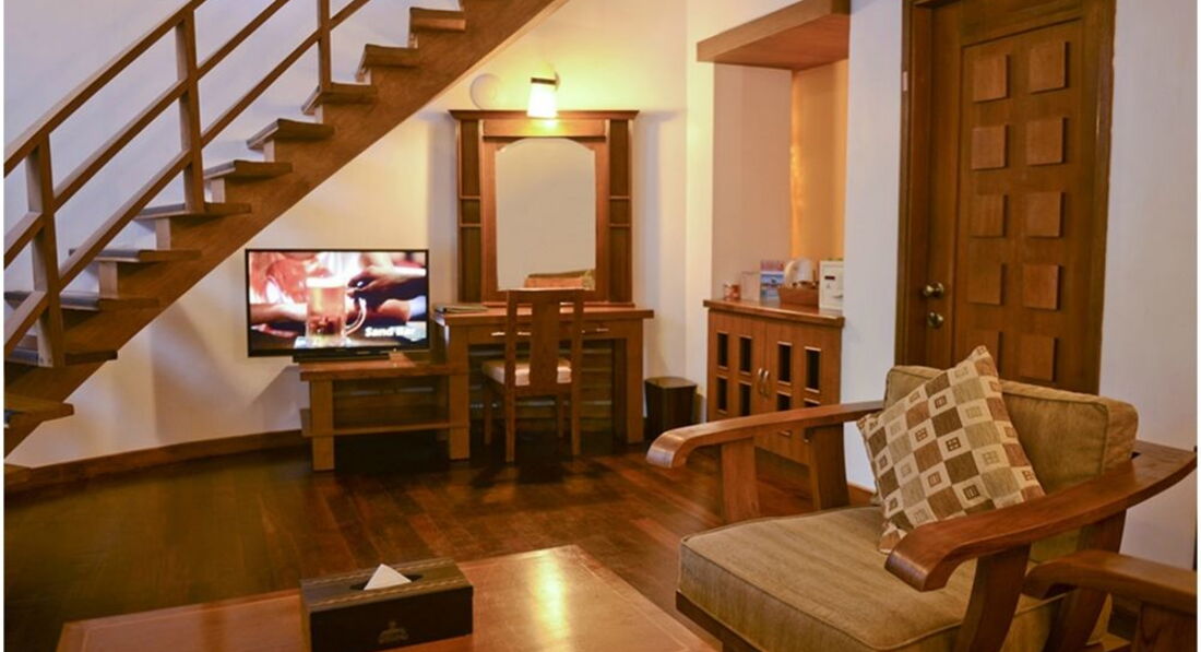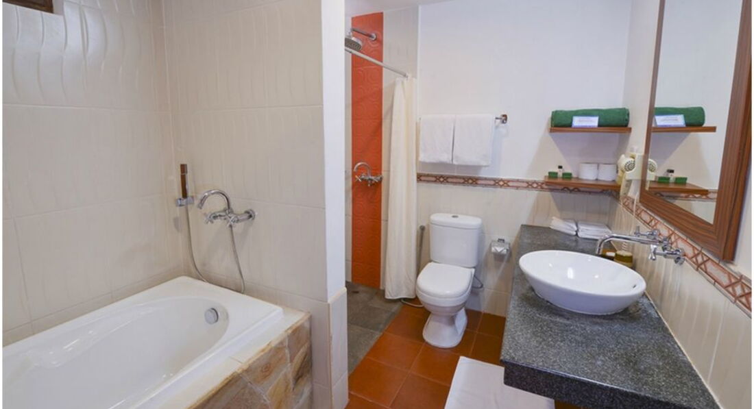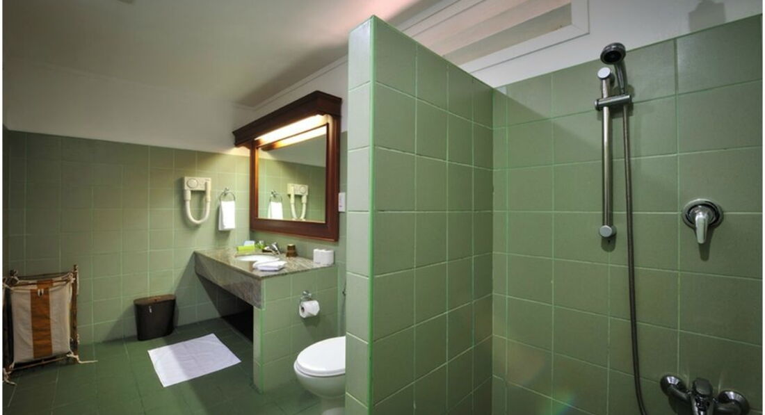 Бич вилла условно двухэтажная. Внизу большая комната с диванами, креслами, телевизором, холодильником. На втором уровне, поднявшись по лестнице, попадаешь на площадку, где расположена кровать двуспальная и выход на небольшой балкон. На нижнем уровне, выйдя из комнаты через дверь, под крышей, на свежем воздухе, двойной умывальник, туалет и душ со свободным выходом в маленький, огороженный двухметровой стеной, внутренний дворик весь в зеленых насаждениях. Во дворике второй душ и по центру дворика круглая ванна джакузи под крышей. Следует отметить очень мощный кондиционер, которым советую пользоваться осторожно. Телевизор без русских каналов, да мы и не смотрели. Насчет других номеров, стандартов, супериор и гарден смотрели в общем, все неплохие, всем оборудованы, специально брать бич виллу мы бы не стали, но повезло, так повезло.