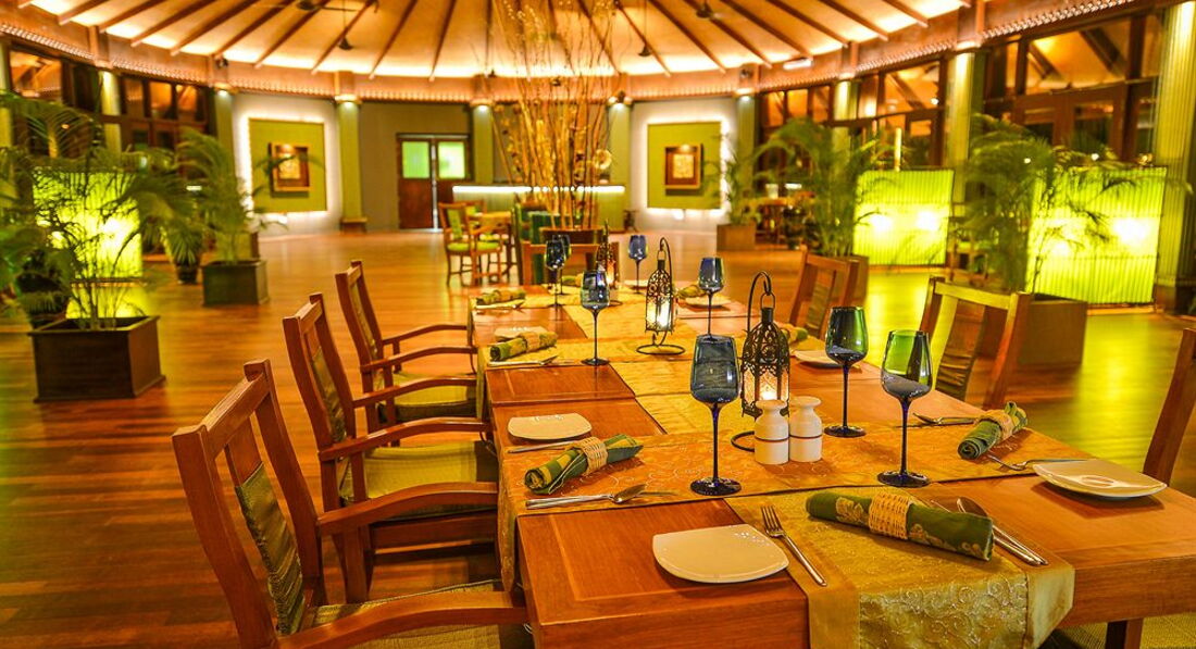 ресторан нормальный. два крыла. мы почему-то всегда обедали в левом. в правом крыле по вечерам за стойкой был повар и при нас разделывал фрукты на выбор - маракуйи, дыни, драконьи фрукты и тп. показываешь ему фрукт - он для тебя его чистит или режет. голодными мы не были. но я ела очень осторожно. первые дни вообще одни только фрукты и рис:)) подруга на этом же острове отравилась мороженым в прошлом году. подробности описывать не буду, но было очень неприятно - не то слово. Нам повезло. у нас был полупансион - на обед мы ели фрукты и пили соки. есть овощи, макароны, соусы для салатов, рыба, мясо, бывали морепродукты, но как-то редко. или я не замечала:) вечерами сидели в баре, танцевали, гуляли по острову. он маленький - по берегу можно обойти весь меньше, чем за час. территория продумана, уютно и приятно. на острове живут яркие птички! а с пирса в чистейшем море можно наблюдать за цветными рыбками, скатами, акулками и другими обитателями.