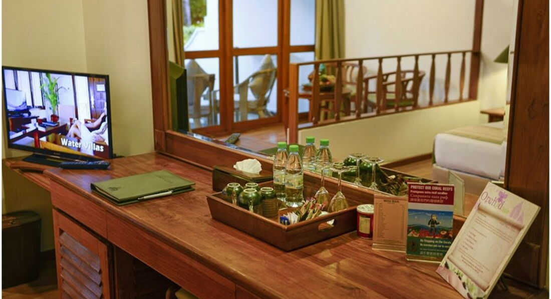 Номера. Считаю самыми удобными бич виллы с джакузи. Понравились по расположениею еще гарден виллы сдвоенные у бассейна и сдвоенные делюкс рум, стандарты идут по четыре и далеко уже расположены от основного ресторана и выходят на более ветреное и волнистое побережье, и их много соответственно и людей тоже. Пляж у бич вилл считаю самым удачным. Мы не надевали спец обувь, мягкий песочек на берегу, кораловвый в воде, сами кораллы есть конечно, но мы не лезли в камни. Рыбки плавали у камней, риф близко, муж сноркал и видел черепаху. Как то раз лодку с прозрачным дном сопровождал дельфин в этом месте, наблюдали с берега. Риф там хороший. В общем нас всех пляж устроил и детей тоже. Но замечу уединенности там нет, как на другой стороне не знаю, но когда мы туда ходили на разведку в обед, дул очень сильный ветер в той части и нам показалось это очень некомфортно. У нас тоже дул, но не напрягал, а даже спасал и не казалось очень жарко. Купались напротив 120+ бич вилл до вотэр вилл. Зонтов нет, прятались под деревьями, проблем с лежаками не было, а нас шесть человек. Номера нас устроили вполне, просторные, не новые, но не обшарпанные. Кондиционеры работали тихо, совсем не мешали, можно настроить на определенную температуру, их два по одному на этаж, и работают они независимо от карточки. Для детей не совсем удобна лестница, ставят внизу доп кровать, за которую мы, поставив при заполнении брони на агоде возраста ребенка доплатили. И дверь в ванной на доводчике, ребенку ее тяжело открыть. Есть халаты, шампуни, мыло, нет зубных щеток, пасты, тапочек. В номере был переходник, можно попросить если нет. гладильную доску и утюг тоже приносят по просьбе. Телевизор ЖК, флэшку проигрывает. WiFi был везде и бесплатный, без проблем отправляла фотки по почте, но скачать что-то за бесплатно нельзя, мы для работы брали симку в аэропорту. Убирались дважды в день, чаевые оставляли. В последний день днем нам наполнили и украсили джакузи. Джакузи не все исправны, не все режимы. У друзей был День рождения, отелем это никак не было замечено, вообще((