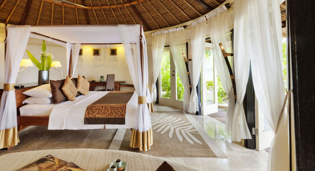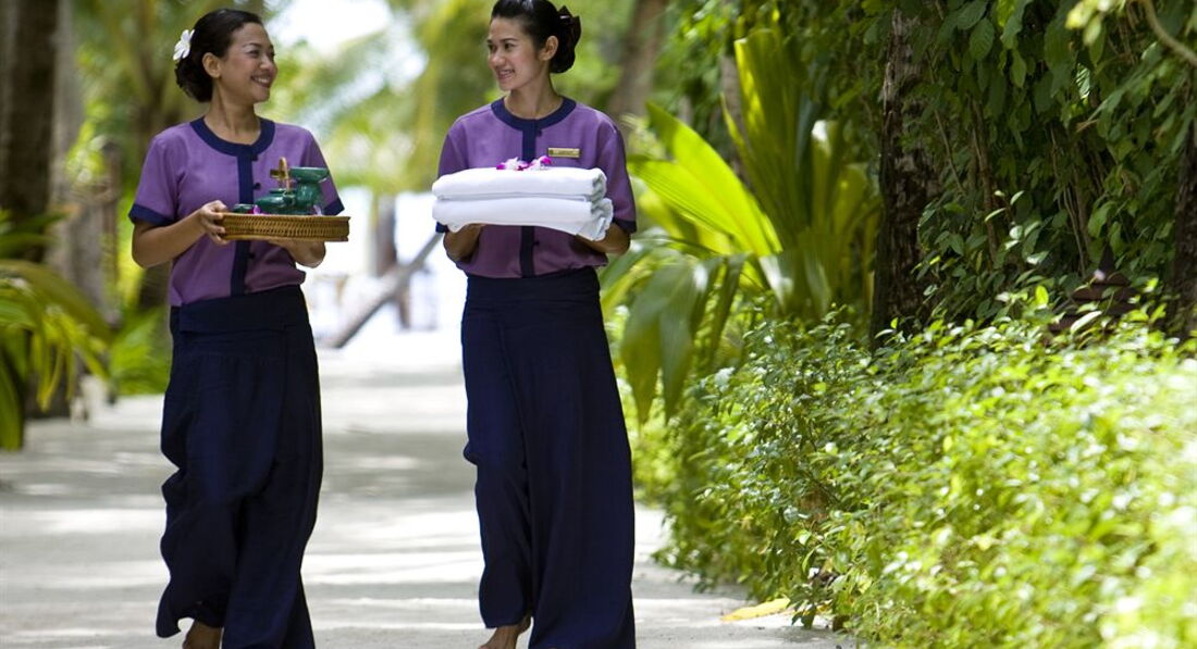 Добрый день период отдыха 4мая по 12 мая 2013. Буду кратка и по сути. Летели Аэрофлотом- супер самолет 2-4-2 месте очень удобно если летите вдвоем .Полет 8-25. По прилету встретили забрали чемоданы и проводили на катер. До острова (если ветер и большие волны плыть 45 мин - обратно плыли 30) Погода просто отличная никаких муссонов и круглосуточных дождей( был два раза дождь ночью). На острове встретил сам менеджер, с барабаном и напитками (пишут что заселение с 14-00 нас заселили сразу в12-00). Виллу брали в саду номер 38 САМАЯ СУПЕРСКАЯ - бассейн+ ждакузи. Бунгало в глубине сада и мимо проходящие не глазеют в номер и после 12-ти можно спрятаться на лежанка в саду в прохладе сада. Номер отличный -все исправно работает. есть чайник , телевизор,dvd музыкальный центр в котором прокручивается диск с релаксирующей музыкой- аромолампа. Питание брали завтрак(все вкусно свежие соки кофе вода входят) обед и ужин(только по меню на выбор ) В отеле много японцев(если они без детей то тихие- если с детьми БЕРЕГИТЕСЬ - эти тамагочи орут 24 часа в сутки-а родителя по барабану). Спиртное свое не провезет-отниму в аэропорте.На острове вино 175$ бокал 10-13$ шампанское бутылка 200$ вода 1,5л 3,5$ кола 5,5$ соки свежевыжатые 8$ питание пицца 18$ стейк 30$Сувениры в отеле дорогие - все можно купить при вылете в аэропорту . Массажи только комплексами с пилингом и обертыванием минимальная цена 165$. Отношение просто царское , персонал вежливый,улыбчивый. Чаевые включены везде в цены-но мы оставляли нашему консьержу по 5$ и в ресторане тоже нашему официанту.Кроме нас кажется никто не давал - это дело каждого. Море супер теплое, прозрачное риф поодаль ,так что можно было поплавать . Акул и всякую не честь рядом с берегом не наблюдали - только по вечерам на пристани . Остров только для пар и романтики- полный релакс и спокойствие. Фотосессия 30фото на диске+ 3 распечатанной 180$(с налогами) мы с мужем просто без ума от этого отеля- всем рекомендуем .