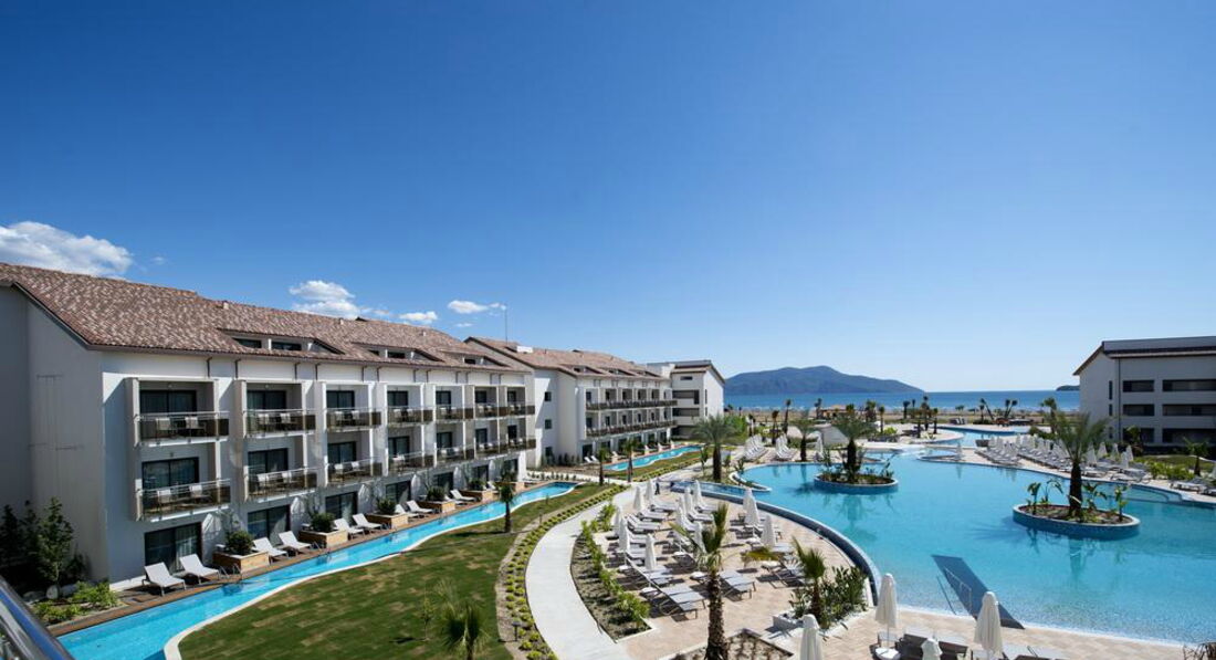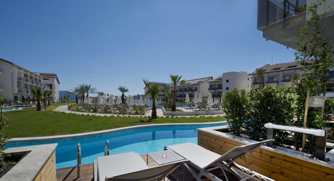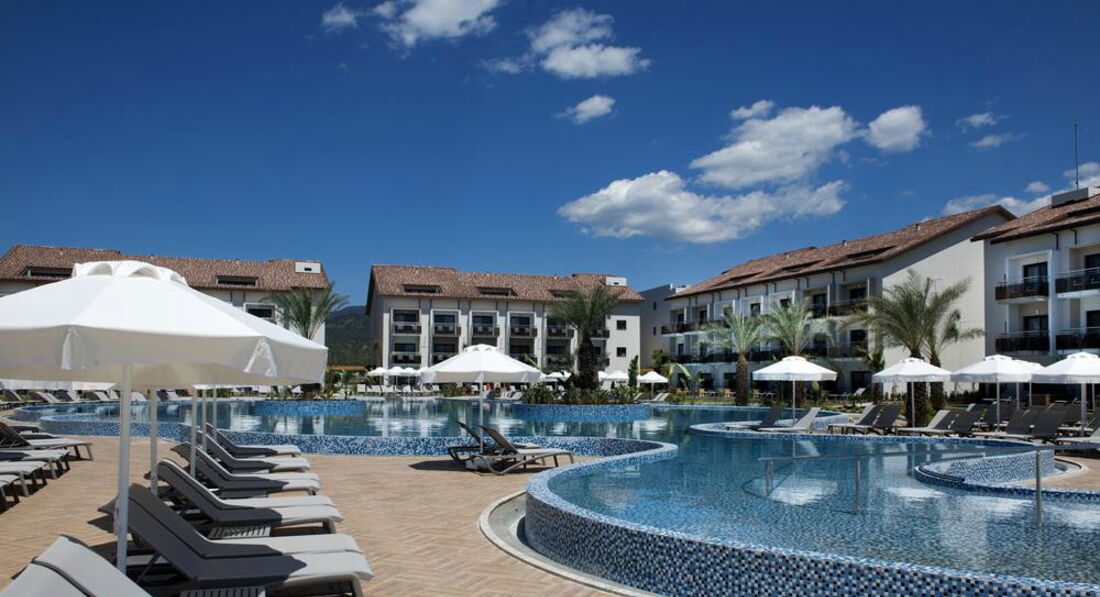 Только что вернулись из Фетхие, летали с маленьким ребенком 1,5 годика, отдохнули просто замечательно! Отель совсем новый, рискнули и забронировали его как раз к официальному открытию 1 мая и ни сколько не пожалели. Летели из Екатеринбурга, авиакомпания Трансаэро, туроператор Библиоглобус, встретили на микроавтобусе, практически индивидуальный трансфер, тк основной поток отдыхающих ехал в мармарис. Доехали за 40 минут, номера еще не были готовы и мы пошли прогуляться по территории отеля, все очень красиво и ухоженно, 4 бассейна включая детский и закрытый бассейн внутри отеля. Номер нам дали просто шикарный, двухкомнатный люкс с видом на море, в номере есть все необходимое, включая халаты для взрослых и детей, детская кроватка, ванные принадлежности, фен, гладильная доска и утюг, мини бар бесплатный, вино в честь приезда, полотенца меняют ежедневно. Вид с балкона потрясающий на горы и пляж, мы жили в семейной зоне и номер располагался прямо напротив детского бассейна, детской площадки и водных горок, которые кстати уже работают, но желающих покататься было немного. Мы проводили время в основном у детского бассейна, наш малыш оттуда не вылазил, вода прогревается очень быстро, потому что глубина всего 40 см, деток было много, каждая вторая семья с маленькими детьми и одни сплошные коляски, все таки отель больше ориентирован на них поэтому семейная зона достаточно большая. Мини клуб еще не работал, мы зашли внутрь посмотреть, но там еще все обустраивают, так и не удалось за 10 дней там поиграть ребенку. Анимации нет, возможно еще не сезон, поэтому по вечерам время проводили в лобби баре, очень понравилась живая музыка за роялем, все коктейли бесплатно, но после 12 часть из них за доп плату. Контингент в основном немцы и англичане. На территории бесподобная кофейня с кучей сладостей и мороженым в любое время, несколько а ля карт ресторанов, мы сходили только в итальянский, главный ресторан нам нравился больше, огромный выбор изысканных блюд, салаты из морепродуктов, детский стол утром и вечером, блюда на Гриле, питание и севис на высоте! В отеле есть детские коляски и стульчики в ресторане, детское питание в баночках по утрам можно взять овощное и фруктовое пюре. Пляж широкий белый песчаный, но вход в море галька, мы купались несколько раз, море еще прохладное, зато с погодой повезло 25-30 градусов было. Лежаков море, деревянные кабинки есть и на пляже и у бассейна, все бесплатно. В общем отдыхом остались очень довольны и с удовольствием прилетим еще раз в Барут!