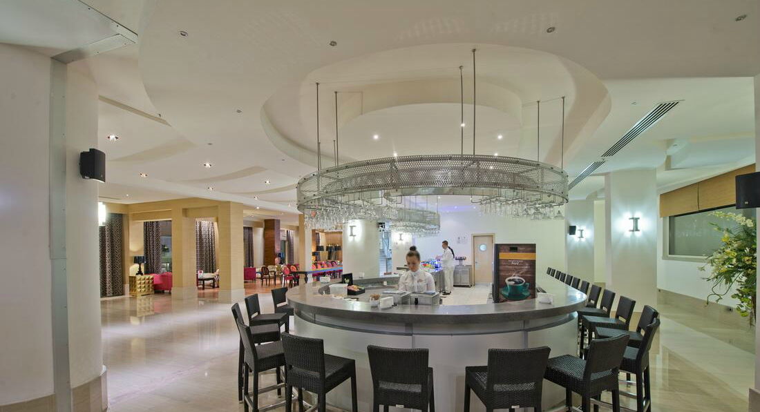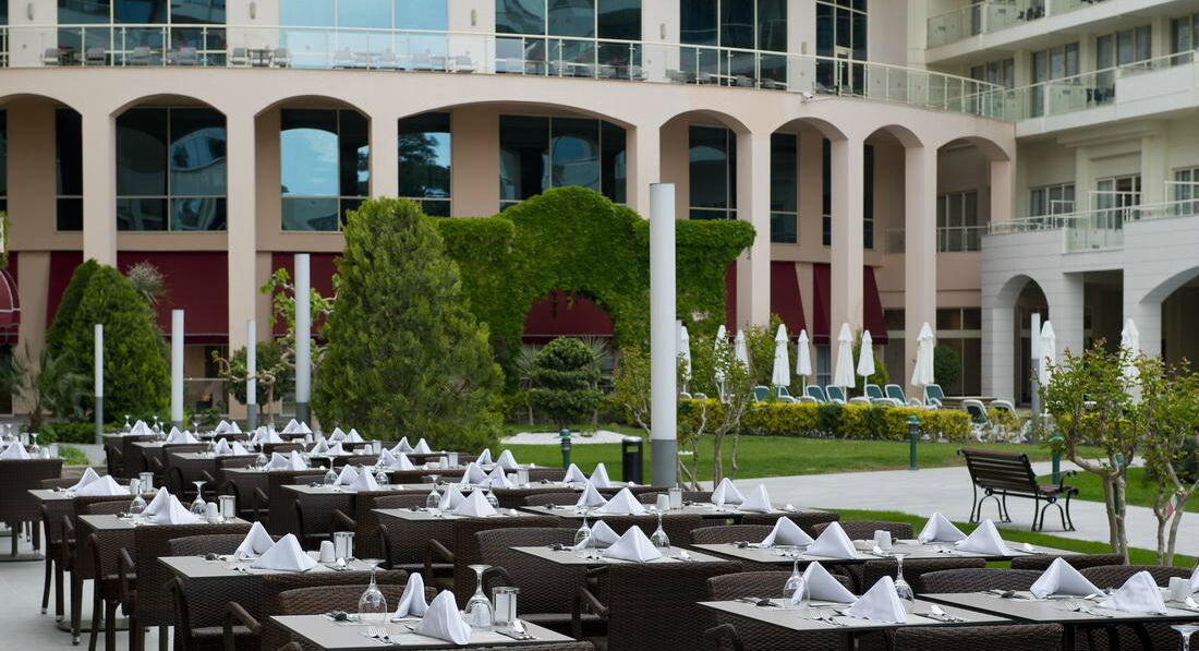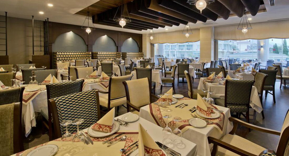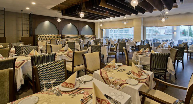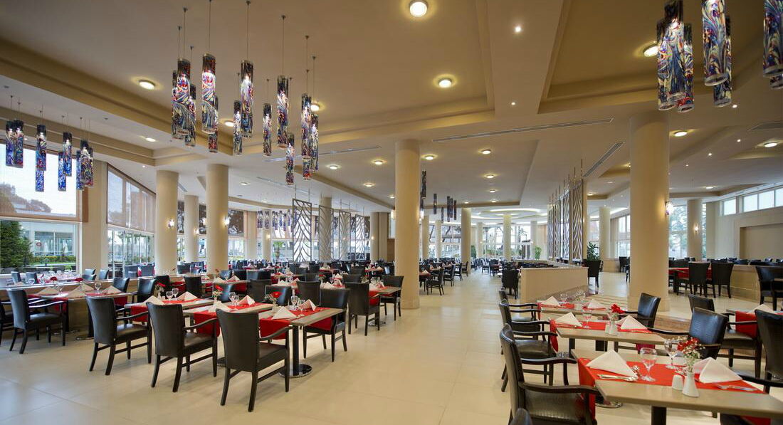 Бари та ресторани: головний ресторан розрахований на 800 осіб (критий, з кондиціонером, літня тераса, дитяче меню, дієтичне меню, дитячі стільці), лобі-бар (24 години), бар біля басейну (10:00-24:00), бар на пляжі (10:00-24:00), диско-бар (23:30-02:30), вітамін-бар (11:00-18:00). 8 ресторанів A la Carte: рибний, японський, турецький – відвідування безкоштовно 1 раз на тиждень; ліванський, китайський, італійський, шведський, барбекю – платно, за попередньою резервацією.