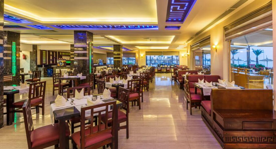 В Египте далеко не первый раз... И этот отель лучший! Прилетели вечером, в отеле были около 22.00. Заселили за 5 минут без всяких доплат и намеков на благодарность, в главный корпус, дали огромный номер с видом на главный бассейн и немного было видно море.. В общем, питание отличное!!! Мясо: курица, индейка, перепела, говядина, кебабы, тефтели и т.д. Рыба в тесте и на гриле. Огромное количество гарниров, зелени, разных соусов, фрукты: яблоки 2 видов, виноград 2 видов, финики, бананы, апельсины - каждый день, чередовались арбуз, дыня, инжир. Очень порадовали на завтрак сухофрукты: курага, изюм, чернослив и наличие свежевыжатого апельсинового сока. На пляже лежаков достаточно, конечно чтобы занять лежаки на 1 линии надо встать в 6 утра, но на 3 и 4 линии - были всегда. Бассейны на любой вкус, особенно понравились детский и взрослый с горками. Отдыхали как раз во время проведения Чемпионата Мира по футболу, на улице был большой экран, на котором транслировались все матчи в прямом эфире. Сервис хороший, в ресторанах как только тарелка или бокал пустой официанты сразу забирают все. Напитки официанты приносят сами, не надо вставать и идти наливать соки, воды. Очень понравилась кафешка рядом с ресепшен, где можно попить разного кофейку. Про море не пишу, оно везде в Египте замечательное, теплое и чистое. Заход в море отличный, тапочки не нужны. В день отъезда браслеты не снимают, можно пользоваться всей инфраструктурой до тех пор, пока автобус не заберет вас из отеля. Да, гид от Тезтура - милейший человек, в первый день провел встречу, рассказал где и как его искать в случае необходимости, спросил интересуют ли нас экскурсии и больше мы его не видели.