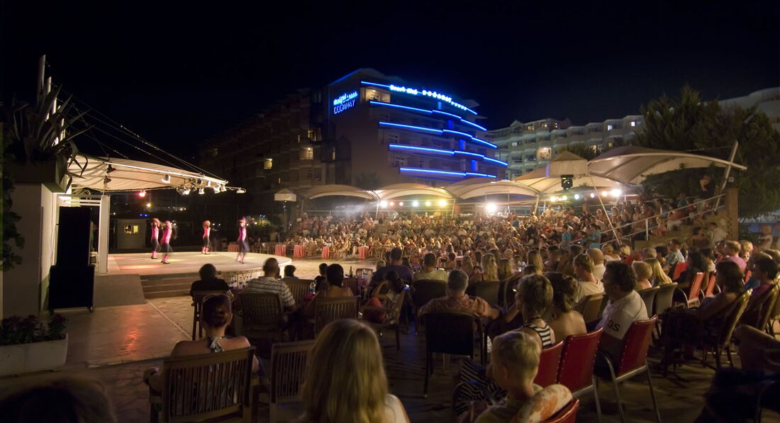 Анимация: незаметная)))днем, об этом я писала выше. Точно знаю что раз в неделю днем пенная дискотека- я не попала , был день моего приезда, думала будут еще такие шоу, но нет! Вечером народ тянется после мини-диско насладиться зрелищами! За 5 дней я увидела концерт славной танцевальной группы( разные танцы танцевали,в том числе "калинку"), на другой день были фокусы- понравилось( это тоже заезжие ) , была турецкая ночь- танцы турецкие - тоже понравилось...больше я не посещала..)) Руководству отеля следует доработать момент, как донести информации для туристов на неделю , что, где и когда будет происходить. Принятый во всех отелях вечер- Миссис и мистер отель я не видела.. Но само место вечерней анимации устроено для удобства зрителей, есть даже столики куда все волокут свои коктейли и кофе, а вот артистом судя по всему не очень удобно с гримерками..