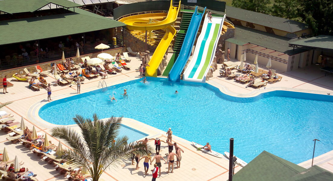 Без опасений можно купаться в бассейнах. Вода в них прекрасная, хлорка вообще не чувствуется. 3 водных горки работают по паре часов утром и вечером; точное время не помню, вроде с 10:00 до 12:00 и с 15:00 до 17:00. Лежаков на пляже и у бассейнов достаточно, всегда найдутся свободные. На пляже и у бассейнов рядом есть, где покушать или просто перекусить/подкрепиться. Везде стоят холодильники с питьевой водой в бутылках.
