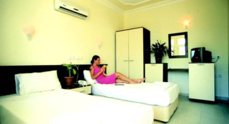 Номера очень небольшие. Уборка в номерах оставляет желать лучшего, но оставленные доллар-другой чаевых резко меняют ситуацию к лучшему (в частности, мне выдали просто гору полотенец, а при заезде в номер там было всего одно). Исправная сантехника, кондиционер, телевизор, довольно новая мебель. Если хотите нормально спать ночью, а не слушать грохот дискотеки и вопли пьяных туристов - просите номера окнами на дворы местных и их теплицу. Идеальная тишина (если, конечно, никакая гнида не врубит телевизор на всю катушку). Еда - довольно простая, по-турецки однообразная, но качественная, сытная и довольно обильная. Самое худшее - завтрак. Яйца вкрутую, жареные сосиски, (один раз, правда, дали омлет и поджаренный хлеб), 2 вида малосъедобных колбасок, сыр, брынза, помидоры-огурцы, дико кислый творог, оливки, маргарин, варенье и мед. Чай и кофе - отвратительные. Почему-то первую неделю были хлопья и молоко, а потом их убрали. Обед и ужин намного лучше, единственное, что огорчает - только один вид фруктов (арбуз, как правило) на десерт. Выбор салатов небольшой. Напитки - по-моему, пить можно только пиво и чистую воду, но это, как говорится, на вкус и цвет. До моря - 6-7 минут пешком (в общем-то, далековато - дальше заявленных 500 метров, конечно). Пляж - 30 лежаков, причем из-за некоторой удаленности отеля от моря ни разу не было случая, чтобы лежаков не хватало - народ, видимо, предпочитает торчать у бассейна. Из несомненных плюсов - очень доброжелательная обслуга. А что меня больше всего обрадовало - ОЧЕНЬ ХОРОШАЯ МУЗЫКА!!! Никакой русской попсы, никакого блатняка - изумительные инструментальные вещи плюс немножко попсы американской, «золотого фонда». Анимации нет, вечером играет танцевальная музыка и светят два софита. В общем, гостиничка для тех, кто согласен на довольно скромный, непритязательный отдых.