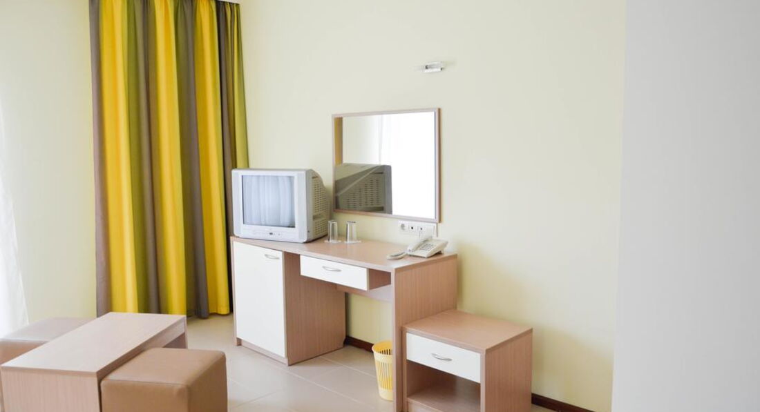 Мы отдыхали вдвоем с сыном. Прилетели рано утром. На рецепшене с извиняющейся улыбкой нам сказали, что заселение возможно только с 12-00 и предложили разместить вещи в комнате персонала, что мы и сделали, сразу же отправились на пляж. Сразу хочу сказать, что до пляжа 1 700 м, причем до моря - это спуск вниз, а вот обратно.... Как компенсация - ежедневный бесплатный автобус от отеля до Золотых песков. Номер чистый, все необходимое есть: кровати, кондиционер, холодильник, душ, телевизор с 3 русскоязычными каналами. Только рекомендую сразу проверить наличие пульто, у нас не оказалось пульта от TV. На рецепшене очень удивились, но тут же выдали запасной.